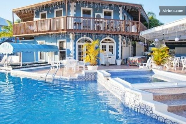 Coral at Taino Beach: Grand Villa, 4-Bedrooms, Beds 8 comfortly, up to 14 max., with 4 Baths, 2 Kitchens and 2 Kitchenettes. Grand Villa meri približno 1400 kvadratnih metrov. Vila Lockoff, ki združuje 4 sobe: 2 garsonjeri in 2 enoti učinkovitosti. Vsaka enota spi 2 udobno, največ 3-4 osebe in ima svojo kopalnico. Garsonjere imajo po dve pogradi, vsaka pa ima po en pograd, ki je primeren za dodatne otroke.
