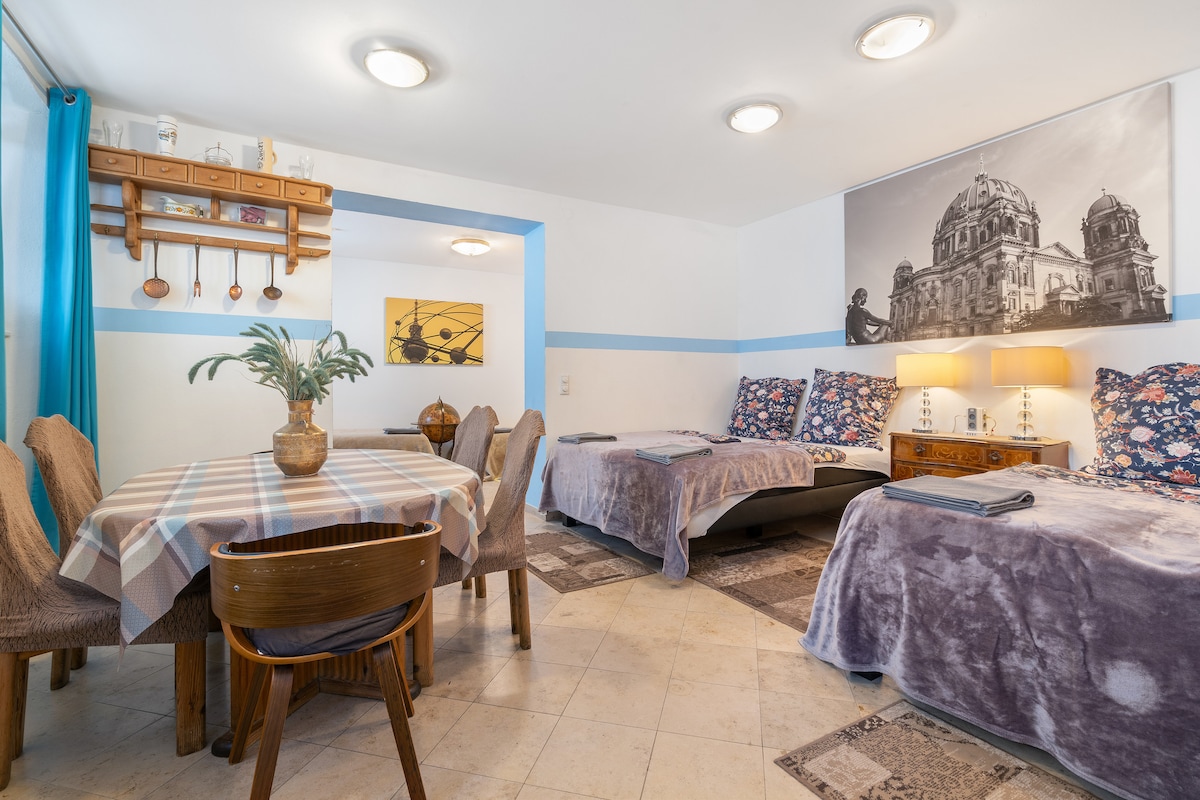 Little studio (35 m2) in the best city location, near Alexanderplatz (main square of Berlin). Ideal for couples. Easy to get to main station (Hbf). PROS: 1A location (Rosenthaler Platz) + subway in front of the house + WiFi + high quality queen size bed + hairdryer + incl. towels & bedlinen + coocking facilities + elevator + windows to quiet yard + check-in at night possible + babybed (if needed) + unique design CONTRAS: no parking places in the area - no washing machine - no a/c - expensive