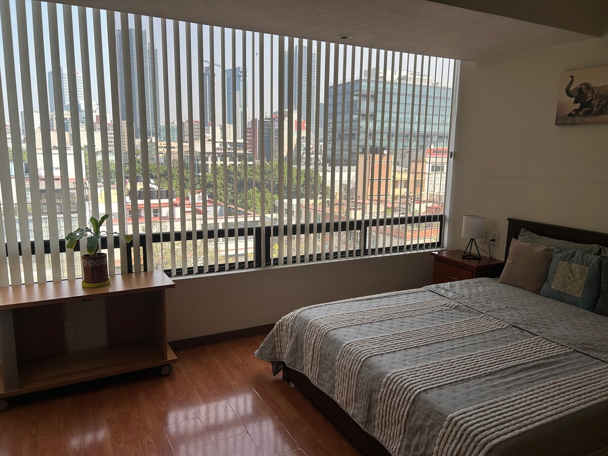 Uživajte v čudovitem čistem in razkuženem stanovanju v mansardnem slogu s spektakularnim razgledom na Ciudad de Méxicu iz 11. nadstropja, ves dan pa je tudi zelo prezračeno. Posodili vam bomo predpražnik za jogo, da boste lahko telovadili med opazovanjem mesta. Kopalnica je popolna in opremljena za vaše udobje. Preverite svoja družbena omrežja z visokohitrostnim internetom in uživajte v Netflixu, ki ima televizor. Počutite se mirno z non stop nadzorom v stavbi (z dvigalom). Območje je zelo varno.