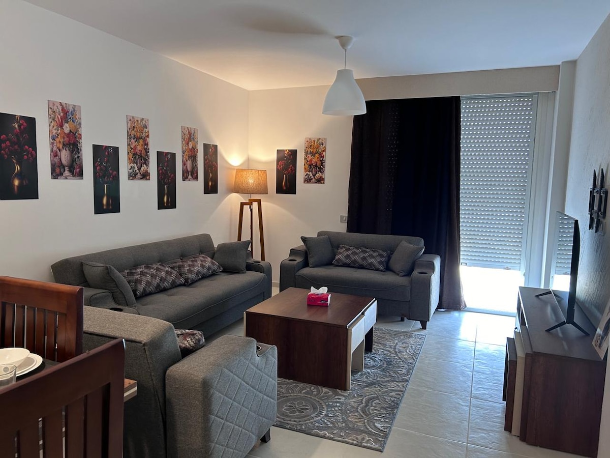 Relax with the whole family at this peaceful place to stay. This apartment boasts a stunning lagoon view and is conveniently accessible. You got it right! our ground floor cozy Twin house will Fit in for a beautiful vacation : • 3 Bedrooms with ACs (1master) • Fully air conditioned • 2 bathrooms • Open kitchen with dining table • High end kitchen and appliances • Electric shutters • Brand New Furniture & Appliances • Smart TV and Netflix • Microwave • Coffee machine • Cattle • Washing machine