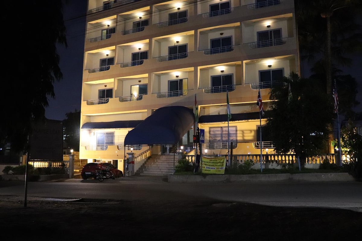 Korejski hotel Maple Leaf ima bar in klimatizirane sobe z lastno kopalnico in satelitsko televizijo. Plaža je oddaljena 15 km. Nastanitve v korejskem hotelu Maple Leaf imajo zasebno kopalnico s kadjo ali prho. Vse sobe vključujejo tudi omaro in pisalno mizo. Vsak dan je na voljo kontinentalni zajtrk, gostje pa lahko zahtevajo tudi doma pripravljen lokalni obrok. Nakupovalno središče Achimota je od namestitve oddaljeno 2 km, nakupovalno središče Melcom pa 700 metrov. Hotel se nahaja 10 km od mednarodnega letališča Kotoka.