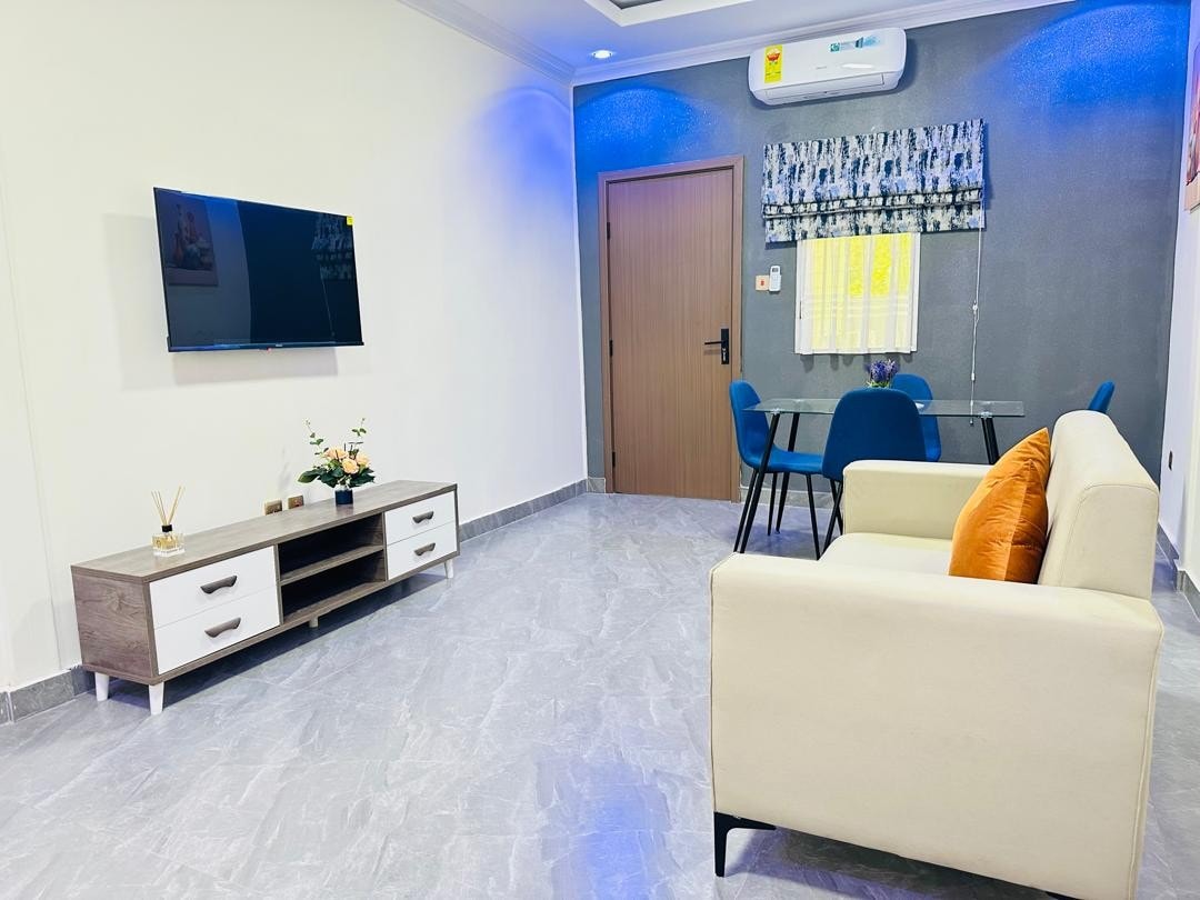 Dobrodošli v prestižnem mestnem oddihu v mestu Accra! Z osupljivim razgledom na gore Aburi, le nekaj minut vožnje ali 15 minut hoje. Manj kot 12 milj od letališča, naravnost na M4 brez zavojev. Naše dvosobno stanovanje ponuja veselje in udobje z non stop varnostjo, non stop elektriko in vodo, z ekskluzivno opremo, kot so bazen, strešna terasa, sodobna telovadnica, polna kuhinja, Wi-Fi, žar in še več, zaradi česar bo vaše bivanje resnično nepozabno.