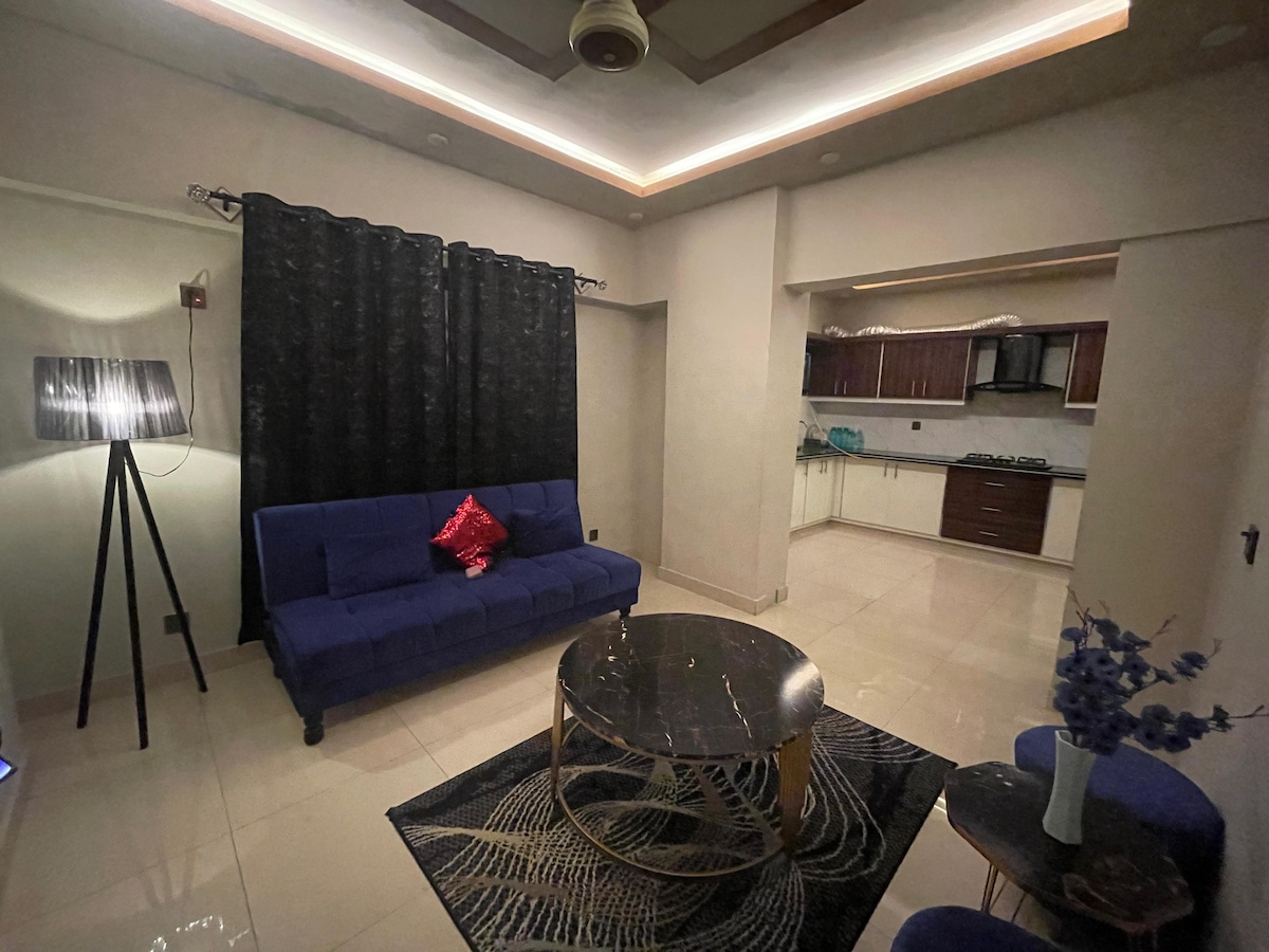 Doživite sodobno življenje v tem elegantnem dvosobnem stanovanju na ulici Shahrah-e-Pakistan, v bližini Ayesha Manzil in nasproti Aga Khan Jamaatkhana v Karimabadu. Dvigalo se odpre neposredno v stanovanje, zato gostje uživajo v udobju in varnosti. Prenočišče ima 2 prostorni spalnici s kopalnicama, dnevno sobo s 65-palčnim pametnim televizorjem, popolnoma opremljeno kuhinjo in pogled na mesto – kot nalašč za družine, poslovne potnike in kratkotrajna bivanja v Karačiju.