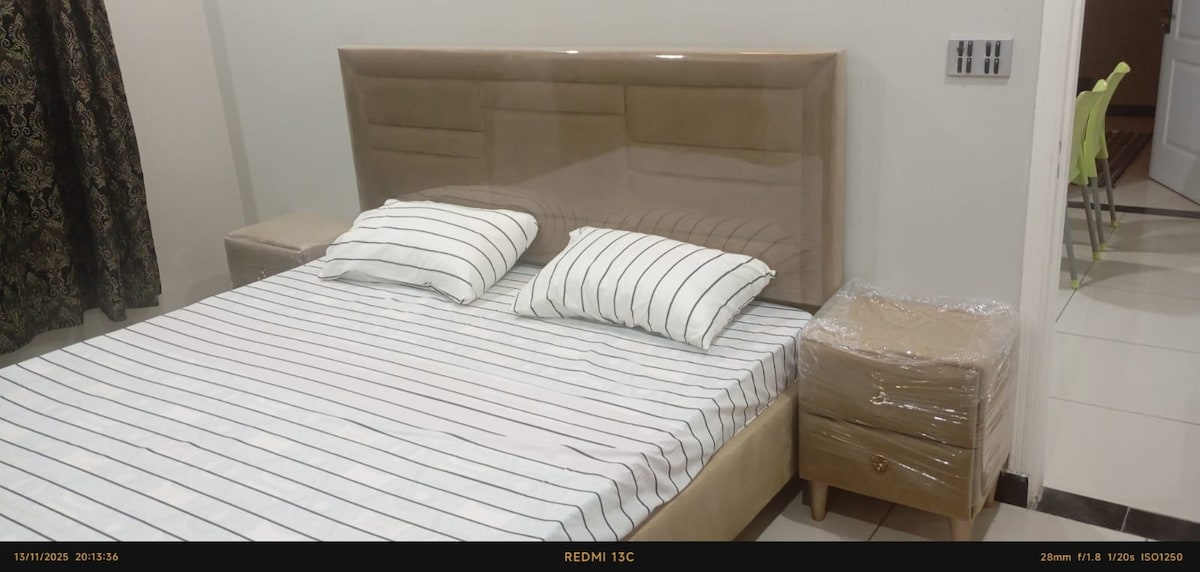 Luxurious place to stay in the center of Karachi. Located in Gulshan e Iqbal, Block 13-A which is connected to all important areas of the city. 2 Bedrooms available, both with attached bathrooms. A living room with a TV as well. All 3 of them air conditioned. Moreover, a Kitchen for the guest's use only. WiFi will also be provided. • 5 minutes from Expo Centre (1.8 km) • 4 minutes from Civic Center (1.7 km) • 7 minutes from Agha Khan hospital (3.5 km) • 9 minutes from Liaquat National (4.2 km)