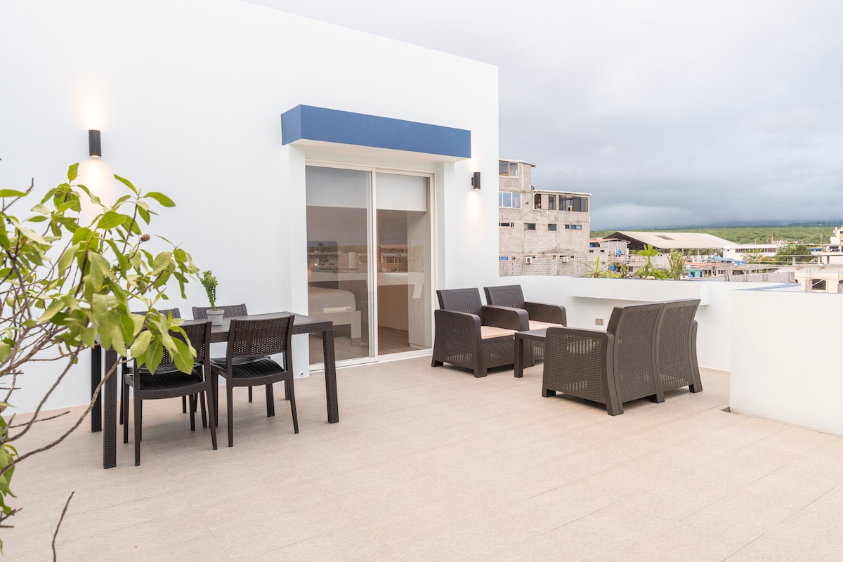 Ubicado en la terraza de uno de los edificios más altos de la isla, encontrarás una maravillosa vista todo el día. Muy fácil de localizar, en av. principal Baltra. Rodeado de restaurantes, tiendas y cajero automático Banco Pichincha cruzando la calle. A 4 cuadras de Terminal Terrestre y 3 cuadras de Mercado Municipal y parada de bus a zonas rurales. Privacidad en tu propia terraza abierta equipada con elementos para ejercitar, comedor y cocina con utensilios. Perfecto para reuniones.