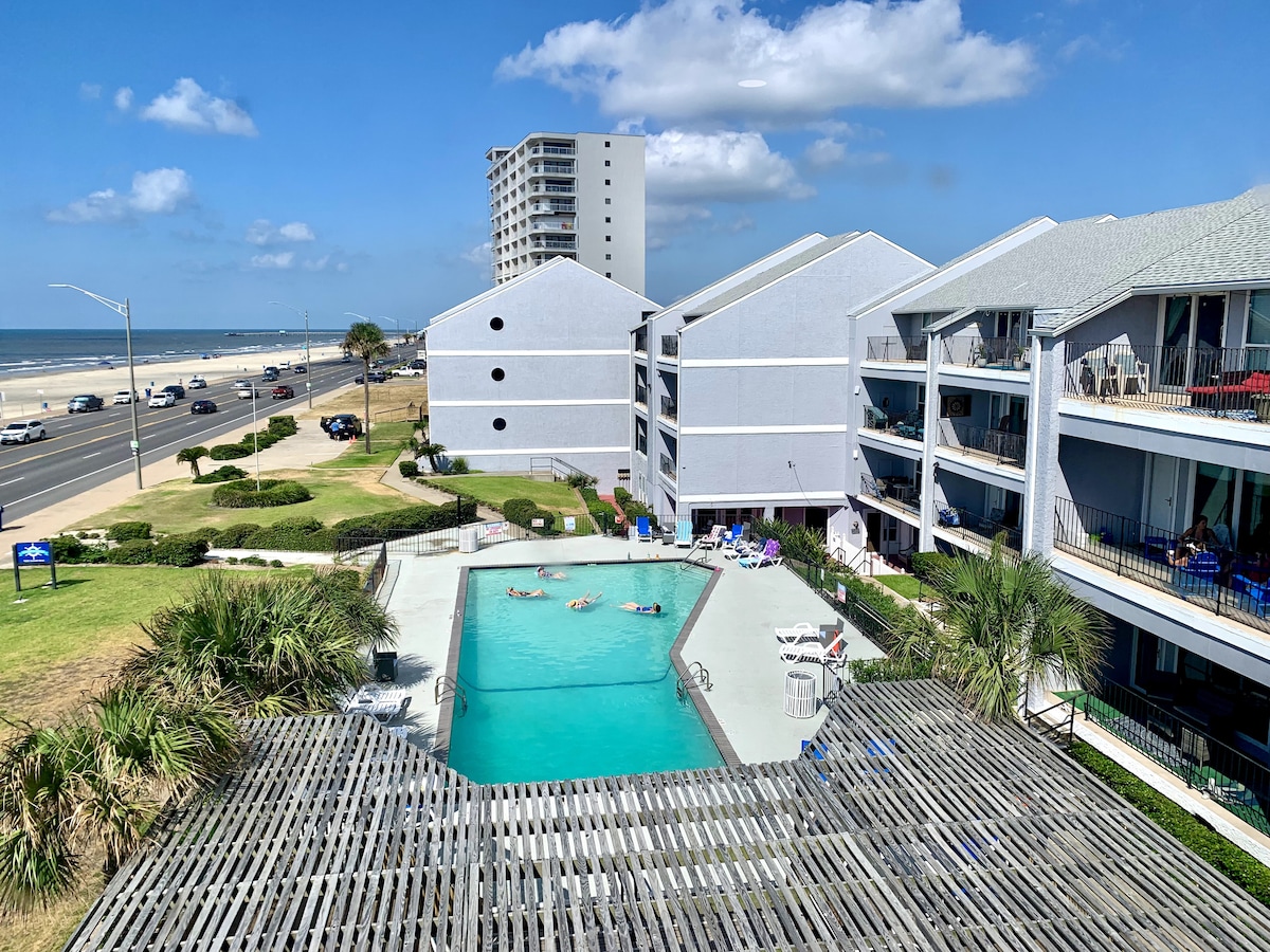 Front row, 1st floor condo facing the ocean and beach at The Dawn - The Dawn was awarded BEST CONDOMINIUM RENTAL 2023, 2024 and 2025! We are steps from the beach. Restaurants, shopping and pier are just minutes away. Wake up to a beautiful view of the ocean from the private patio or enjoy the two pools and hot tub. This is perfect for couples, friends, families for short or long stays.