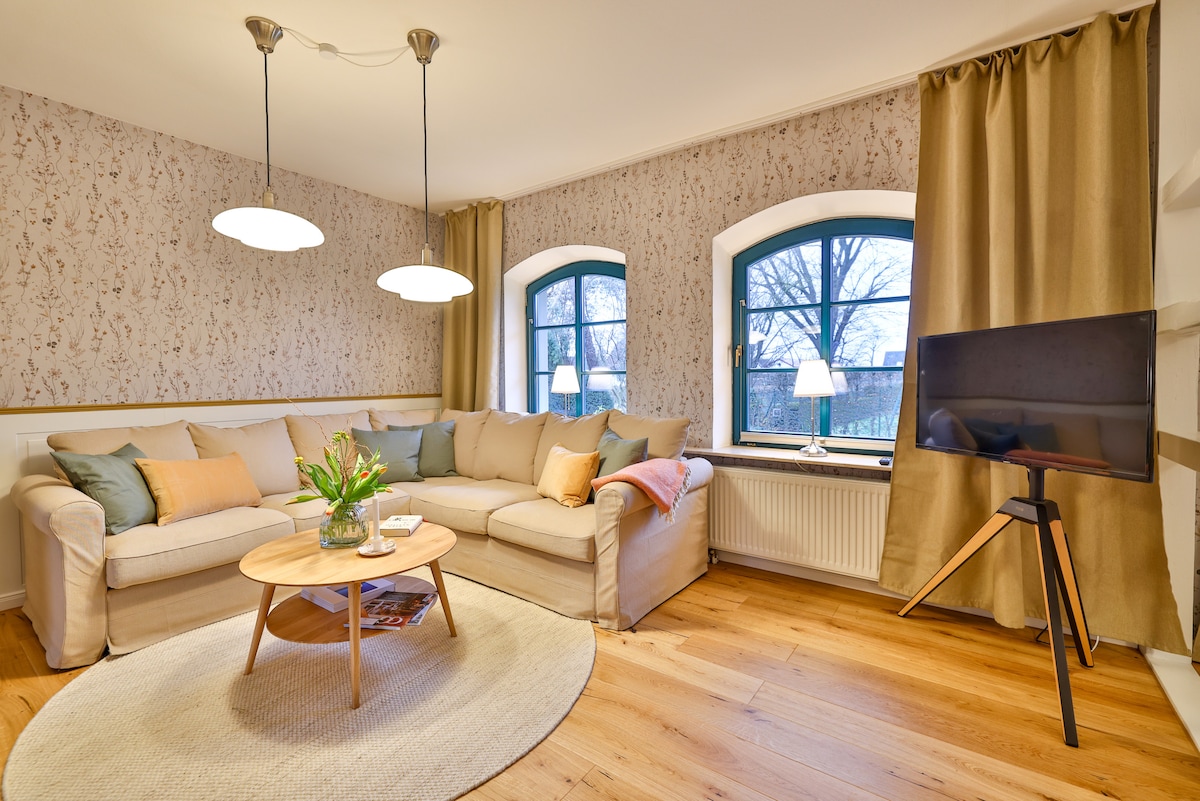 Stanovanje (od sredine julija 2020) je majhno, ljubko in še posebej opremljeno z glinenimi stenami, ročno pobarvanimi opekami na tleh, najljubšimi slikami in pohištvom. Nahaja se poleg hiše, v kateri kot družina z otroki živimo na starem trikotnem dvorišču. Ni neposrednih sosedov, veliko narave in lahko se odpravite na čudovite izlete v vse smeri s kolesom ali avtomobilom: Baltiško morje, otoki, Stralsund, Greifswald, Rostock, Mecklenburger Seenplatte, Peene, Tollense...