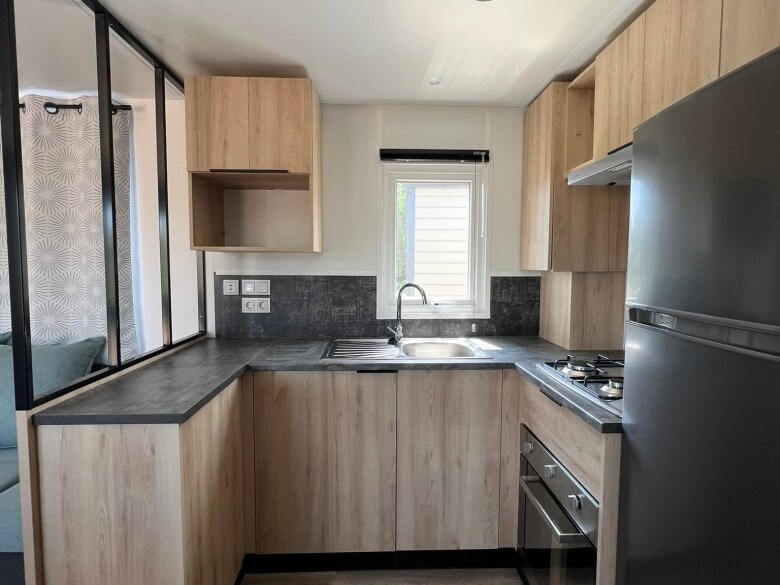 MOBIL-HOME climatisé de 40 m² pouvant accueillir 6 personnes : 3 chambres (1 avec lit 160 cm et 2 avec 2 lits chacune). Cuisine entièrement équipée : plaque de cuisson 4 feux gaz, micro-ondes, réfrigérateur-congélateur, cafetière, grille-pain, vaisselle complète… Barbecue. Salon : TV écran plat, table de salle à manger pour 6 personnes… 2 salles d’eau : douches, lavabos, 2 WC. Terrasse de 20 m² avec salon de jardin, transats, jardin privatif de 220 m²… Camping situé au bord d’un lac