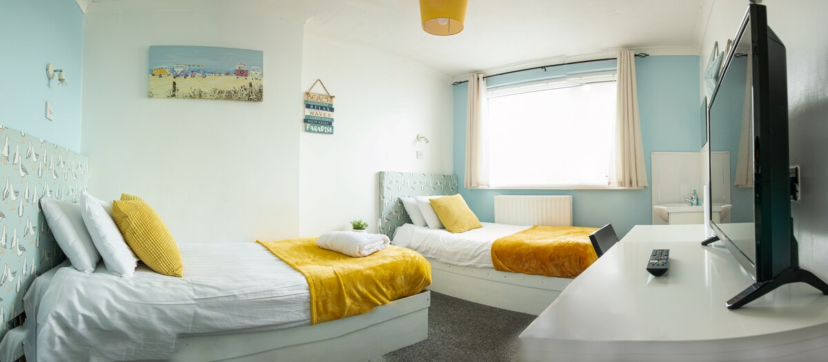 Sodobno 3-nadstropno prenočišče. Gostje lahko uporabljajo izključno sobe v zgornjem nadstropju, ki vključuje dva dvosedežna kavča, televizijo in predvajalniki glasbe/DVD. Kopalnica (kopalnica +prha) in w/c, spalnica z zakonsko posteljo in enojno posteljo, garderobna omara in komplet predalov. Gostje lahko uporabljajo stranišče, vso kuhinjo in jedilnico v pritličju. Durham, Newcastle in Sunderland so oddaljeni le približno 6 milj. Moja hiša se nahaja v mirni slepi ulici, zadnji vrt pa se nahaja na kolesarski stezi ob obali