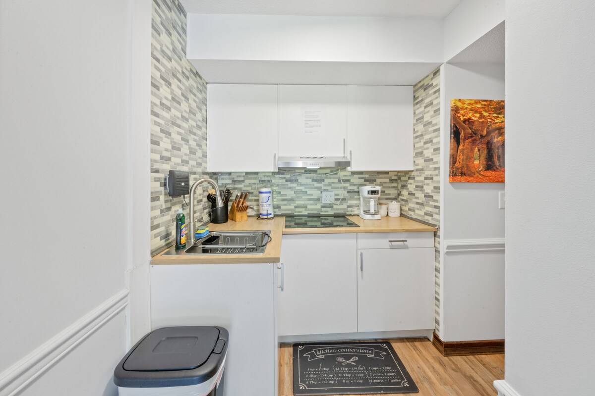 Experience the magic of the Smokies from this tastefully designed condo made for relaxing in the heart of Gatlinburg. Enjoy the King Size bedroom with jacuzzi tub and en suite bathroom. The living room has a sleeper sofa, TV and eating area. Don't forget to relax by the pool in the summer or enjoy the fireplace in the winter and walk down our dedicated pathway to downtown! The Kitchen has an induction cook top, refrigerator, microwave and coffee maker.