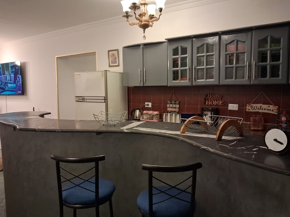 Svetla oaza v bližini mednarodnega letališča Kairo To stanovanje v zgornjem nadstropju se nahaja le nekaj minut od letališča v eni najvarnejših sosesk v Kairu in ponuja popoln mir. Čeprav do četrtega nadstropja ni dvigala, se splača povzpeti po stopnicah, saj boste nagrajeni z osupljivim razgledom na strehi in mirnim vzdušjem. Stanovanje je popolnoma opremljeno za vaše udobje, vključuje pametni televizor 4K z Netflixom in Amazon Prime.