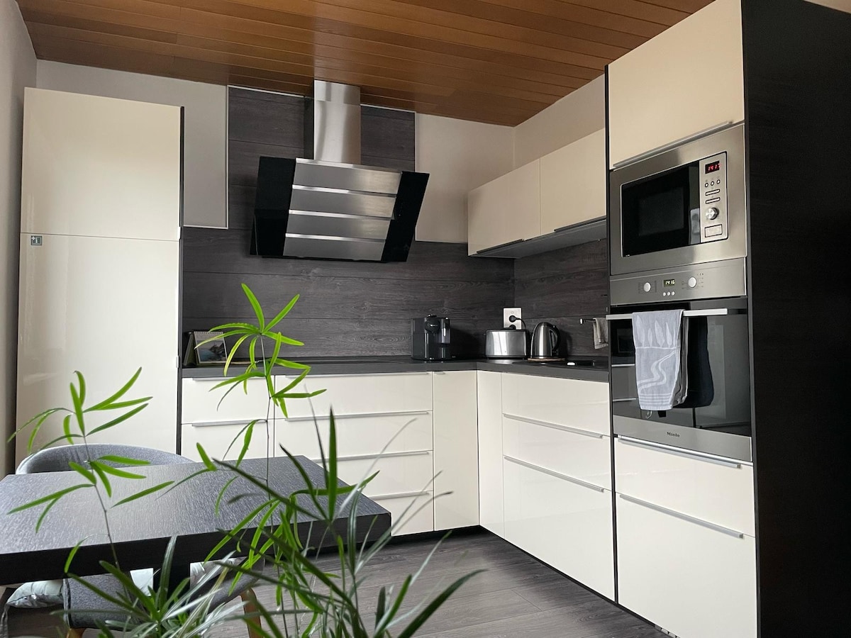 Počutite SE kot doma z nami. Udobno, popolnoma opremljeno 100 kvadratnih metrov veliko stanovanje v 1. nadstropje vam ponuja prostor za do 6 oseb v 3 spalnicah za vaše sproščujoče bivanje. Naša hiša se nahaja v mirnem slepi ulici. Prosimo, upoštevajte, da je naš apartma hišni ljubljenček in brez kajenja! Veselimo se že, da vas bomo lahko sprejeli kot naše goste.