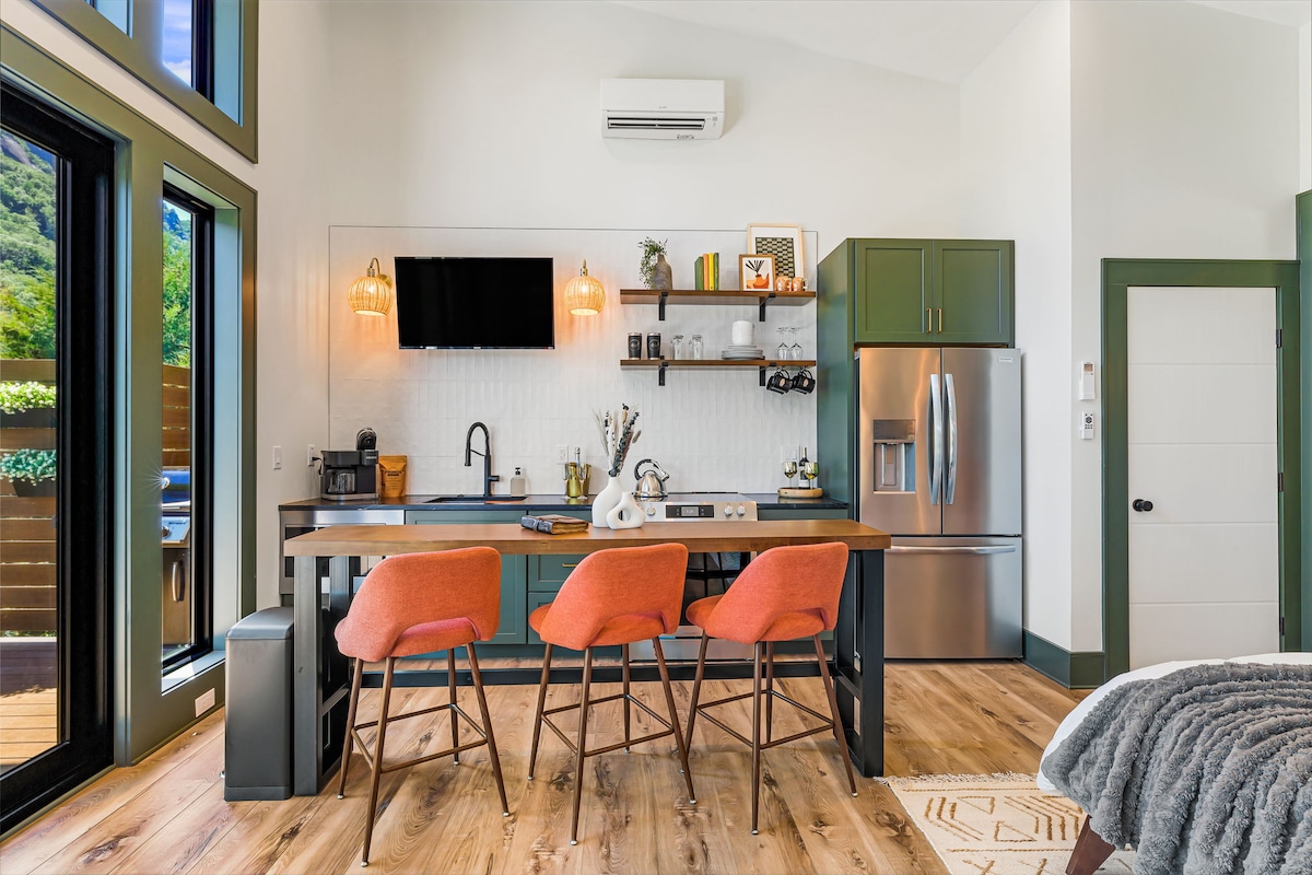 Sprostite se in vdihnite v našem gorskem zdravilišču za pare. Atrium House je zasnovan tako, da je odprt za čudovito gorsko okolico, vendar vam omogoča, da se sprostite v zasebnosti. Naša zunanja terapevtska masažna kad, notranji/zunanji plinski kamin in prostorna prha za dve osebi omogočajo tako miren oddih, da morda ne boste nikoli prišli do bližnjega Ashevilla. Nahajamo se na podeželju, vendar le nekaj več kot 15 minut vožnje od središča Ashevilla, Biltmora, Hendersonvilla, letališča Asheville in številnih pivovarn.