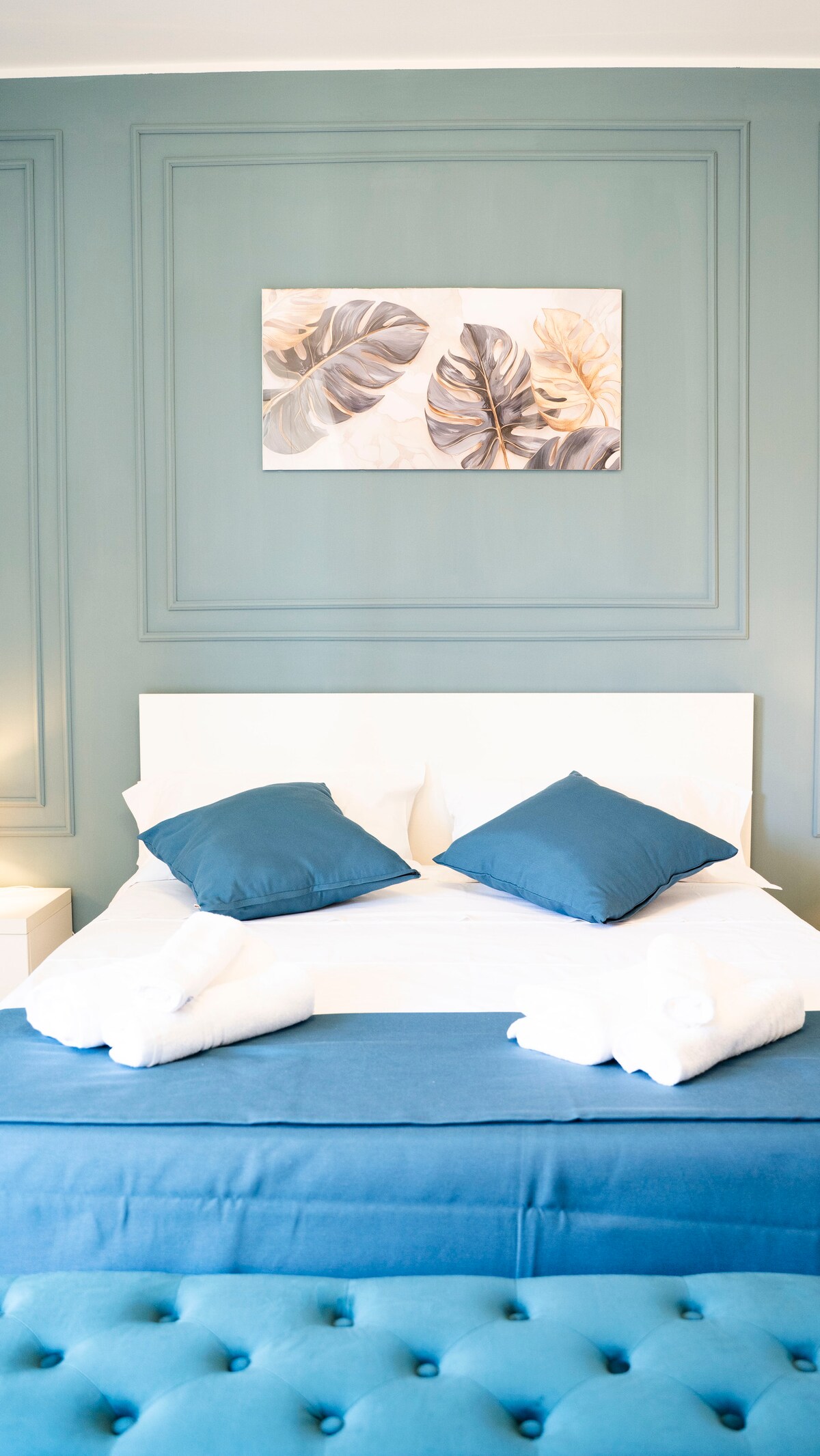 Blue Eleganza je elegantno stanovanje v drugem nadstropju stanovanj La Villa Mora Seaside z dvema spalnicama: eno z zakonsko posteljo in pogledom na morje, drugo pa z ločenima posteljama, ki se lahko združi v dvojno posteljo, zaradi česar je idealno za družine ali prijatelje. Mehki toni in drsna vrata ustvarjajo prostoren občutek odprtega tipa. Stanovanje je popolnoma opremljeno in zasnovano za udobje. Ponuja tudi balkon z osupljivim pogledom na morje. Dvigalo stavbe omogoča neposreden dostop do stanovanja.