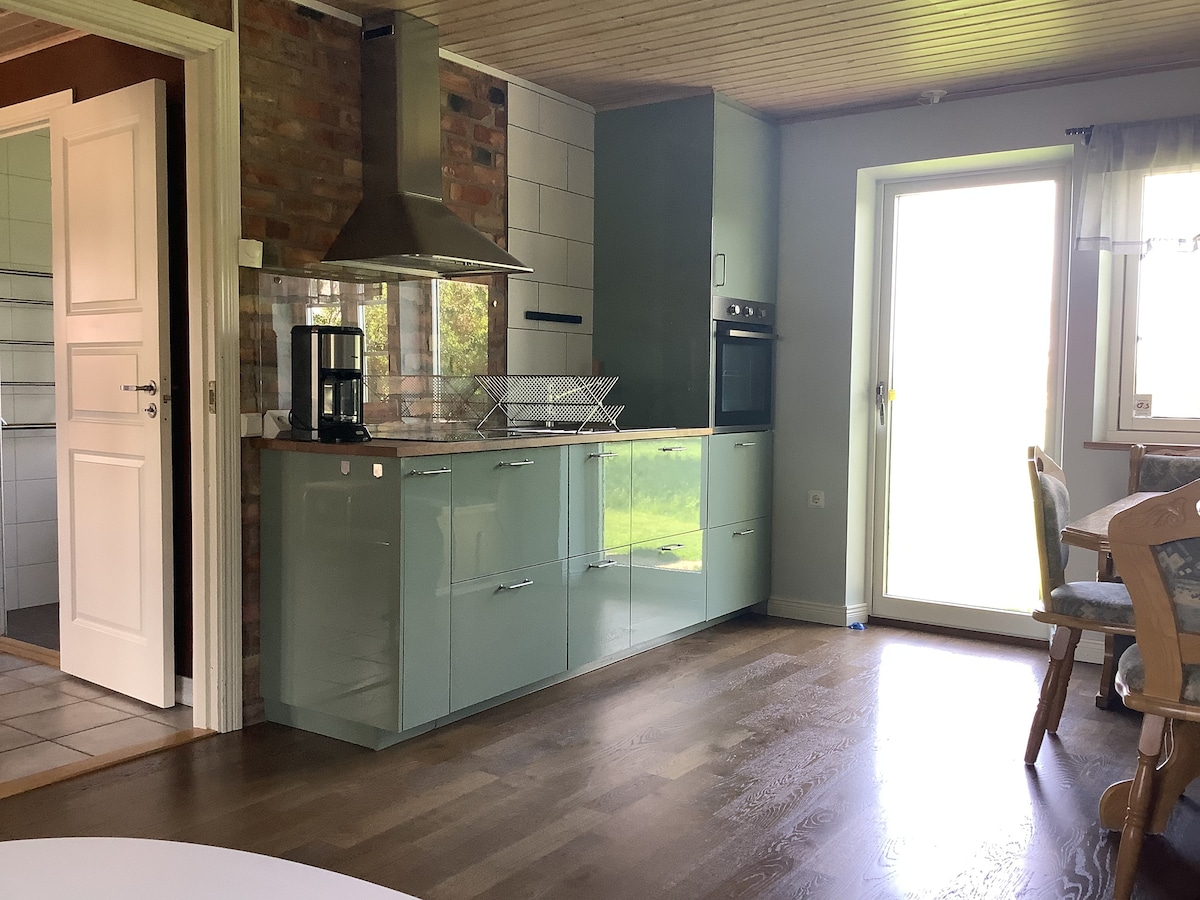 Skønt køkken/alrum med fantastisk lys, både på grund af ovenlysvinduer og stort vinduesparti mod terrassen og haven. Køkkenet har en kogeø, brændeovn og er i åben forbindelse med spise-afdelingen, som igen er delvist åbent til opholdsstue. 2 værelser med stor hems, stort badeværelse med både spa- og brusebad samt bryggers med vaskefaciliteter. Der er 1000 m til nærmeste strand og 2 km til nærmeste indkøbsmuligheder.