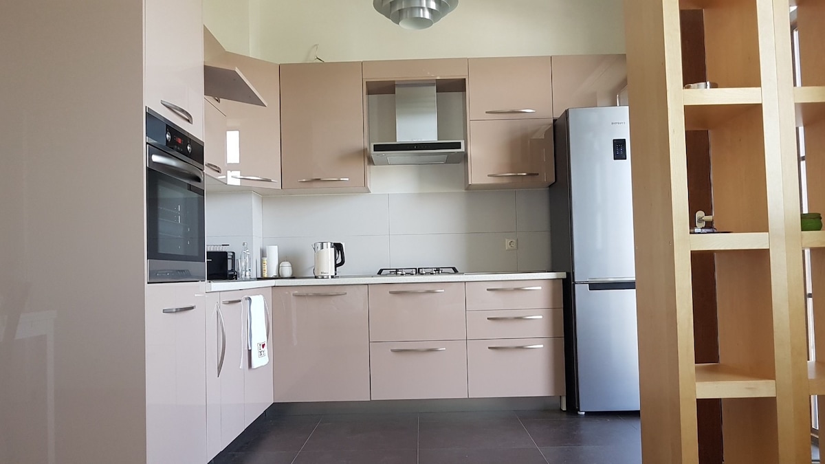 Sprostite se v tem mirnem in elegantnem prostoru. Uživajte v neprevidnem bivanju z vsem, kar potrebujete za počitnice, vključno s prostorom za sedenje na balkonu, popolnoma opremljeno kuhinjo (s pralnim in pomivalnim strojem) in dostopom do čudovitega dvorišča, ki je na voljo samo prebivalcem tega sodobnega in varnega stanovanjskega kompleksa. Enostavna in hitra pot do središča Tbilisija z avtobusom (avtobusna postaja je oddaljena le nekaj korakov) ali s taksijem.