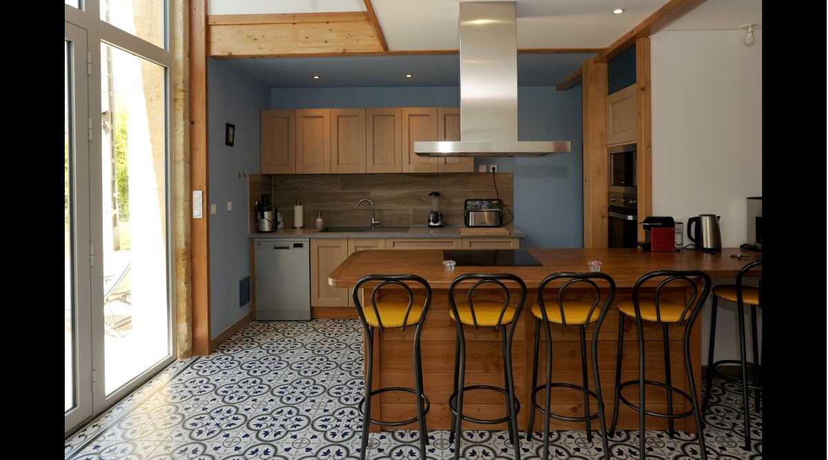 Lovely stone barn in Entre - Deux - Mers wine country, surrounded by picture postcard vineyards and woods, with walks, cycling and Wine Route on the doorstep. Bordeaux and St Emilion are only a 25-min. drive away. The barn sleeps 5, was updated in 2021 and has a spacious open plan living area with fitted kitchen & stylish wood stove. 1 double and 1 twin bedroom with en-suite bathrooms. Extra bed on mezzanine. Wooden deck opens onto our picturesque orchard. Shops and restaurants just 3 km away.