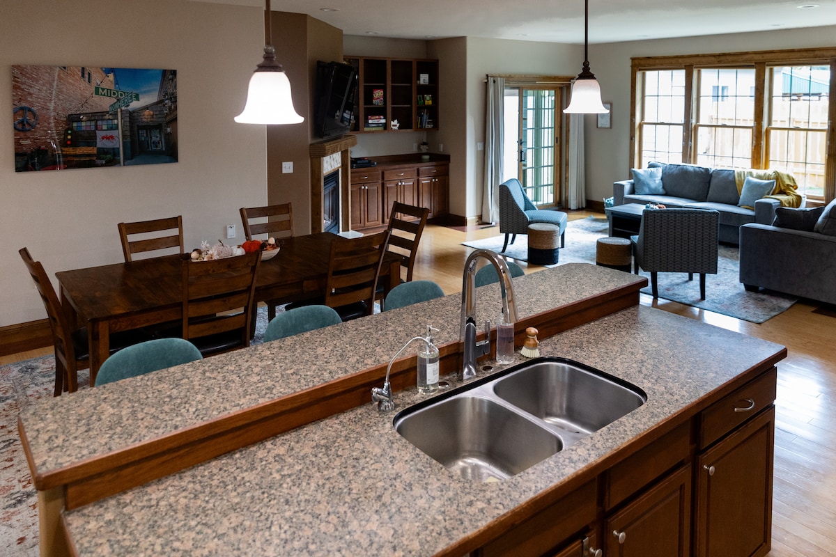 Make some memories at this unique, cozy, family-friendly place. 1,350 sq ft open concept sleeps 4 comfortably in 2 bedrooms, but also has a hide-a-bed that can sleep 2 little ones next to the 6 foot Chicago Cubs logo in one of the living areas. Hot sauce wall is stocked full. One level, has in-floor heating in kitchen, smaller living area and bathroom and both bedrooms. Gas fireplace in main living room, also has window unit air conditioning. Large open yard behind the house.