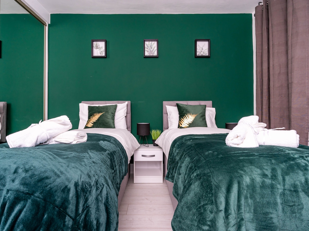 Izjemno veliko, prostorno 4-sobno stanovanje. Blizu mestnega središča, Pacific Quaya (BBC in STV) in West Enda z enostavnim potovanjem po Glasgowu s podzemno železnico. 2 sobi imata postelje Super-Kingsize, 2 z zakonsko posteljo, 3 kopalnice (1 enoposteljna soba) in prho (enoposteljna soba). Vse sobe imajo televizorje Android z omrežjem Wi-Fi in vintage Hi-Fi z bluetoothom je v salonu. Sodobna kuhinja z vgrajenimi napravami in pralnim strojem. Hranite in pojdite po hrani čez cesto.