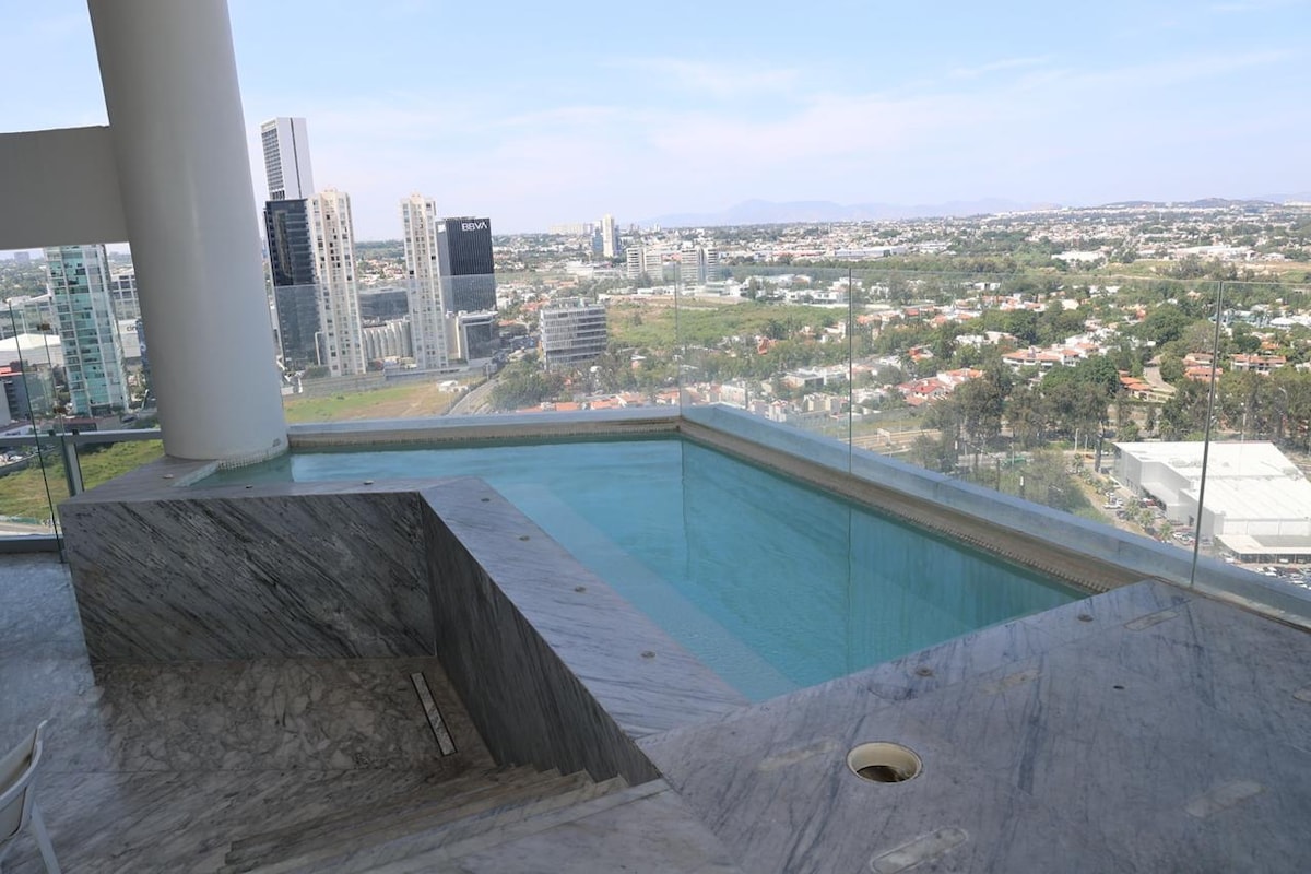 Zelo prostoren dom z dvema spalnicama (King and Queen), klimatsko napravo, pametnimi lučmi, električnimi zavesami, hitrim internetom Wi-Fi, neskončnim bazenom, bivalnim prostorom, strešnim vrtom in vsem, kar potrebujete za en dan ali več mesecev bivanja. Stolp ima nakupovalno območje, vrhunske restavracije in je peš oddaljen od nakupovalnih središč Andares in Acueducto ter gozda The Colomos. Razkužimo in očistimo celotno stanovanje. Preden rezervirate, preberite pravila.