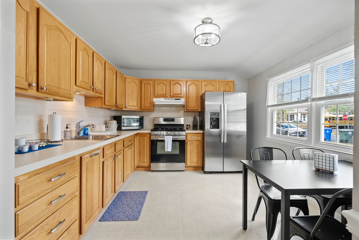 Newly Renovated, centrally located Multi-unit home in a suburban neighborhood. This 1st Floor unit is a 2BR/1BA apartment with a private entrance. Complete with all you need for a work trip, get away or longer stay. The unit features a full kitchen, living room with pull out couch. The Kitchen has full sized stainless steel appliances, dishes, cookware and small kitchen appliances. There is fast Wi-fi, Keyless entry/self check-in, Smart TV's in each room and an in unit Washer and Dryer.