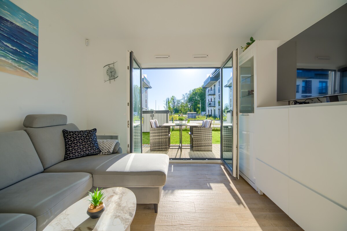 Yellow Marina to 37m apartament z kolorowym, kwiecistym ogrodem do dyspozycji gości. Położony w bardzo spokojnej części Dziwnowka w bezpośrednim sąsiedztwie Zatoki Wrzosowskiej, gdzie znajduje się mała plaża i w sezonie letnim wypożyczalnia sprzętu do sportów wodnych. Apartament posiada osobną sypialnię z dwuosobowym łóżkiem, pokój dzienny z rozkładaną sofą, w pełni wyposażony aneks kuchenny i prywatną łazienkę z prysznicem. Spacer do szerokiej, piaszczystej plazy zajmuje okolo 15 minut.