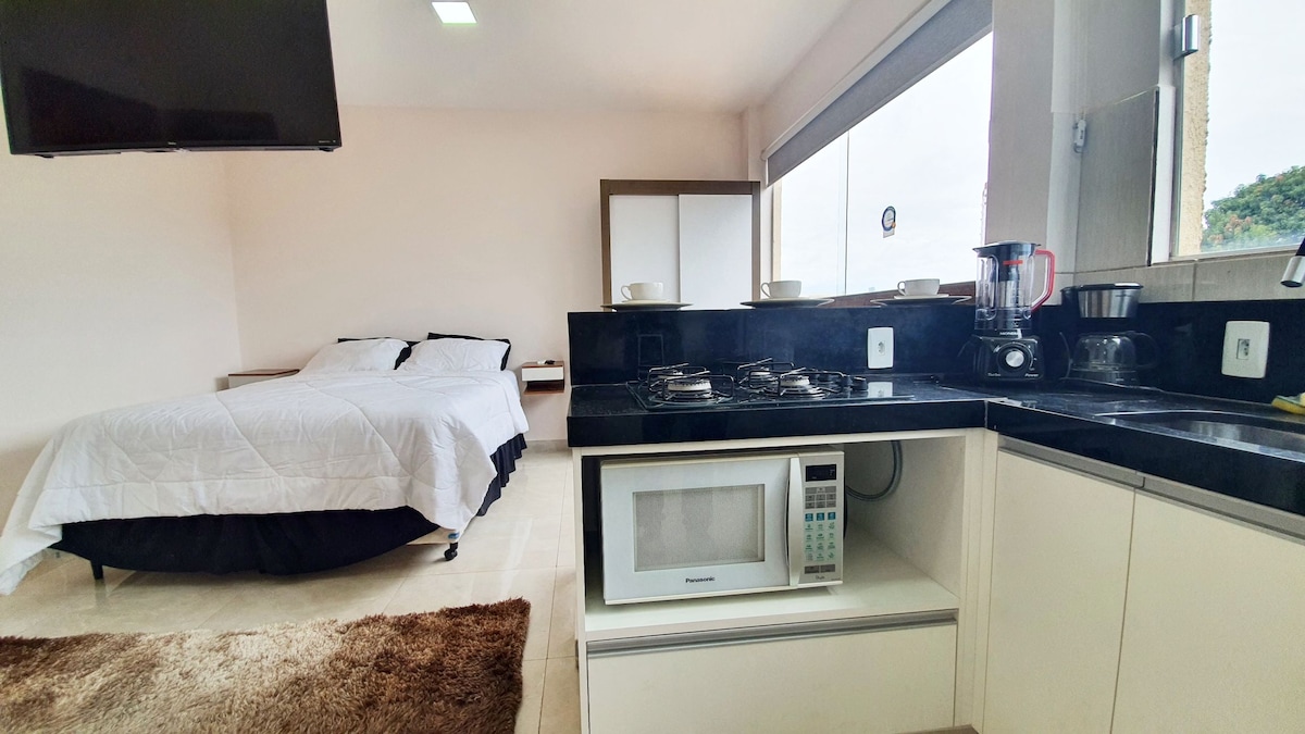 Flat equipado com uma cama box queen size, mesa para notebook, guarda roupas, armários de copa, frigobar, micro-ondas, sofá, ar condicionado, bancada para refeição, 2 bancos, Smart TV (apenas para streaming, não tem TV aberta ou fechada) e Internet dedicada tipo wi-fi. Piso em cerâmica. Vaga de garagem coberta. Vista para a Praça do Sol! Excelente localização! Não há serviço incluso (limpeza e outros). Temos alguns utensílios de copa e roupa de cama. 2 adultos e 1 criança dormindo com os pais.