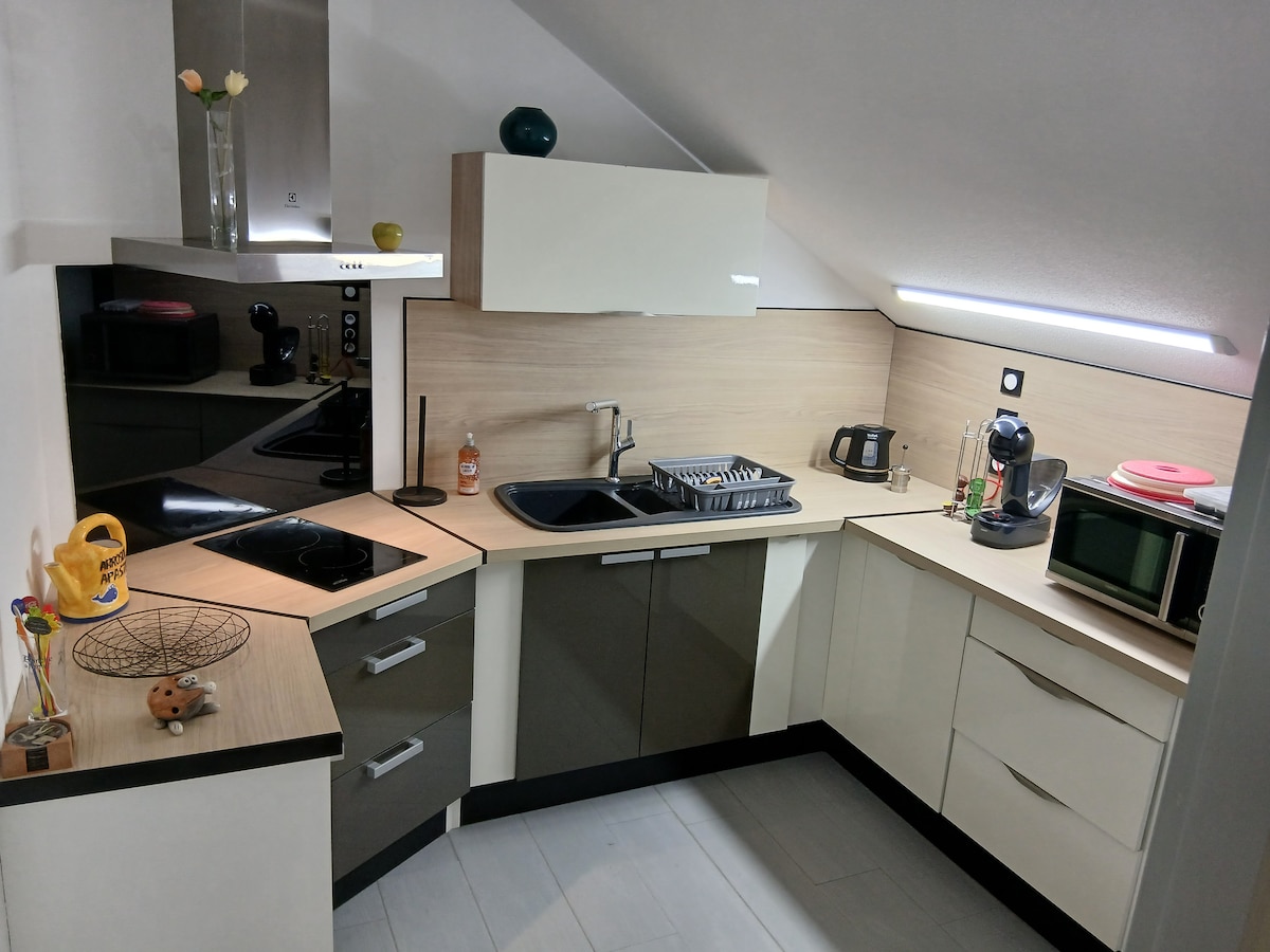 La Suit's Charmes vas sprejme v toplem, zaprtem in pomirjujočem vzdušju. Sanjajte, počivajte, poglejte se, občutite, sprejmite, spoznajte, pobegnite… Ljubite sebe… Pridite in uživajte v očarljivih oblekah!! 75 m2 velika suita, nasproti železniške postaje Belfort Jacuzzi Savna Zakonska postelja (King) 4K Smart TV, Netflix, Orange TV Wi-Fi Notranji kamin Zvezdno nebo XXL večletna prha (deževna prha do zdaj ni na voljo) Vsa posteljnina je zagotovljena Možnost: erotična gugalnica/ šampanjec/naprava za zabave