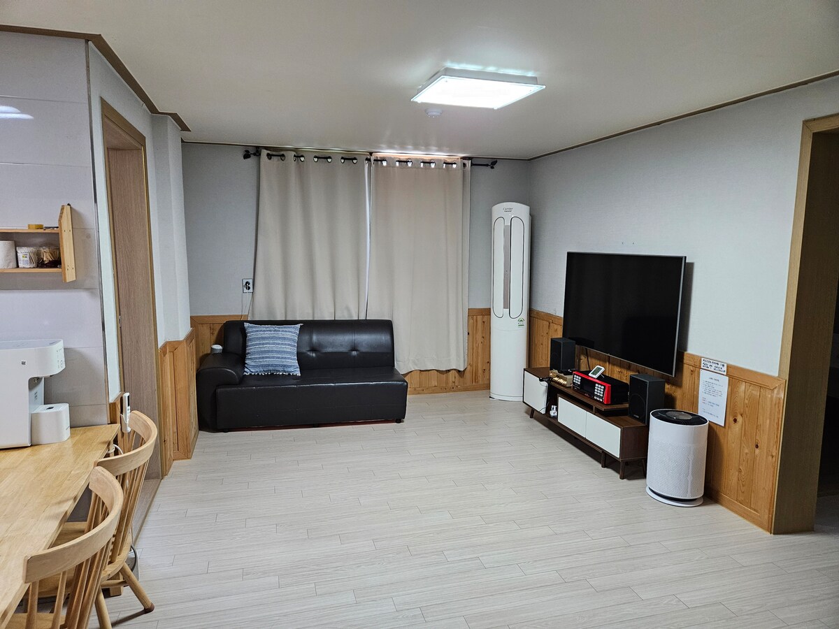 ☆☆ Spomladi se lahko z družino sprehodite po vrtu, polnem cvetja, poleti lahko brezplačno uporabljate zunanji otroški bazen, jeseni pa uživate v hladnem vetriču, ki piha iz doline, in barvitih jesenskih listih. Pozimi pa lahko na ognju pečete sladki krompir in brezplačno uporabljate žar. Ko sneži, se sprehodite po poti s prijateljem. ☆☆ 23 pyeong ekološka lesena hiša s popolno opremo.V vročem poletju sta v dnevni sobi in spalnici 2 klimatski napravi in ventilatorji, na postelji pa je pripravljena tudi hladilna podloga DuraTex. Poleg tega smo v hladilniku pripravili kuhalnik riža Kuchen in riž, da vam ne bo treba kupovati pol dneva. S seboj lahko prinesete hrano in uživate v udobnem bivanju, ki vam bo pomagalo pri okrevanju. ☆☆ V bližini so dolina Hwayang, Seolunsan, Gongrimsa in stara cesta Sanmaki, v 5 minutah pa lahko pridete do banke Nonghyup, velikega supermarketa, tradicionalne tržnice Cheongcheon, gozdne kavarne in restavracije, kjer lahko uživate v okusnem obroku.