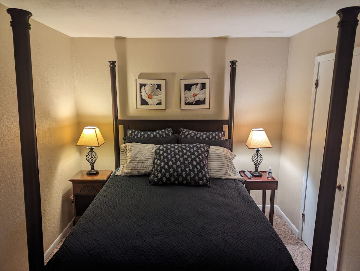 Take it easy at this unique and tranquil getaway. In our one-bedroom apartment, you will find a queen-sized sleep number bed, a full kitchen with dishwasher and your own full-sized bathroom. The pull-out couch in the living room allows a max occupancy of 4. Enjoy evenings gazing at the stars, walk through our wooded paths or enjoy a burger at Dan's Bar & Grill only 3 minutes away. Horseback riding is available on-site. Come enjoy some quiet time in the country in this relaxing getaway.