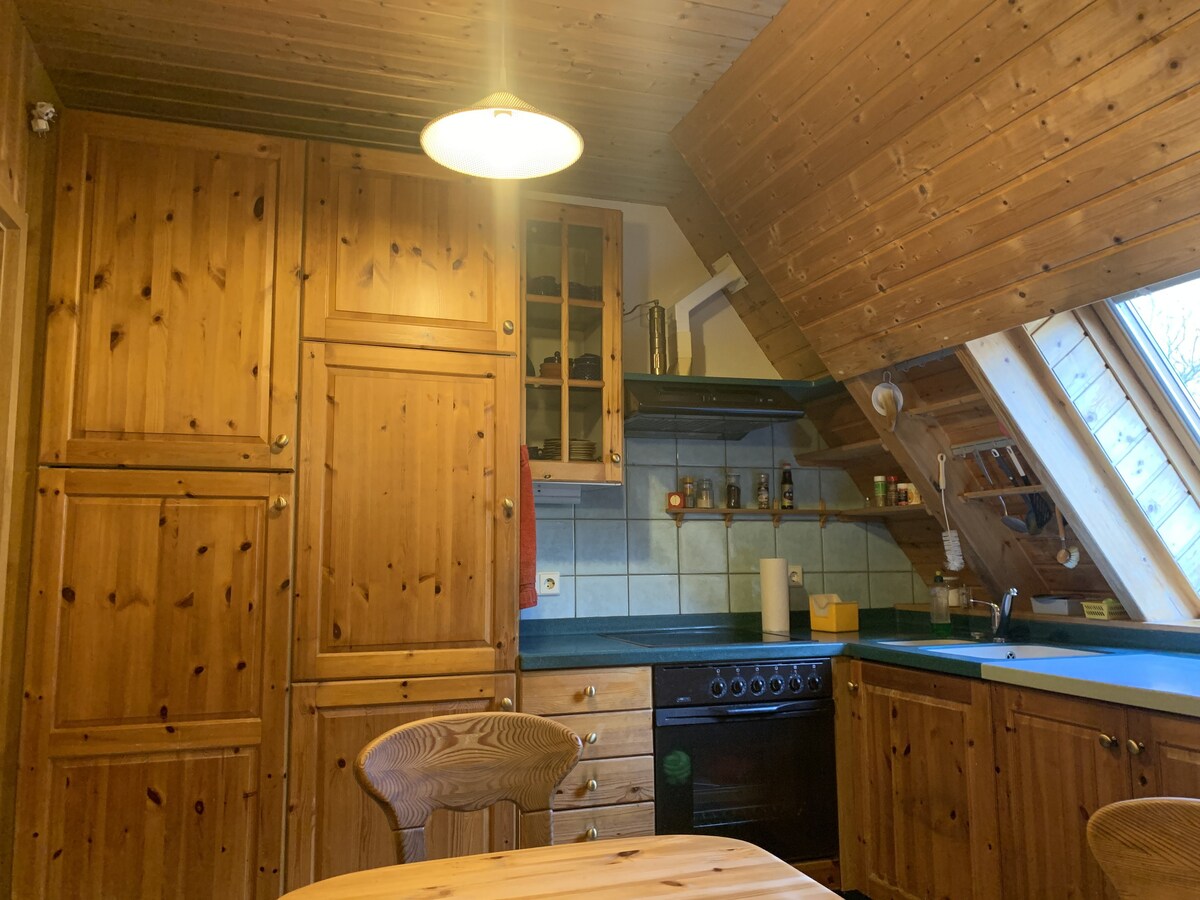 Veliko stanovanje v zgornjem nadstropju s površino približno 100 m2. 1 kuhinja z jedilnico, 1 dnevna soba, 1 dnevna soba/spalnica z raztegljivim kavčem, 2 spalnici z zakonsko posteljo, 1 dodatna spalnica z enojno posteljo, 1 otroška posteljica, 1 kopalnica s prho in kadjo, 1 dodatno stranišče. Uporaba telovadnice v posvetovanju. Zelo mirna lokacija tik ob gozdu. Izhodišče za odlične pohode, kolesarske ali gorske izlete v gore Ore, Augustusburg... Evropska prestolnica kulture 2025 Chemnitz je oddaljena le 15 km.