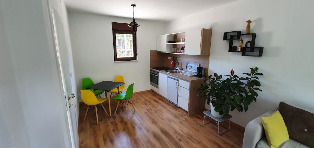 Čudovito enosobno stanovanje v pritličju na reki Neretvi z veliko vrtno teraso s pogledom na Stari most in staro mestno jedro. To prostorno popolnoma opremljeno stanovanje je odlična izbira za par, ki se želi sprostiti in uživati v najboljši vrtni terasi v Mostarju, medtem ko je nekaj minut hoje do številnih restavracij in kavarn v starem mestnem jedru. To stanovanje se nahaja v pritličju trinadstropne stavbe z drugim vnosom AirBnB: Najboljša terasa v Mostarju: Pogled na stari most.