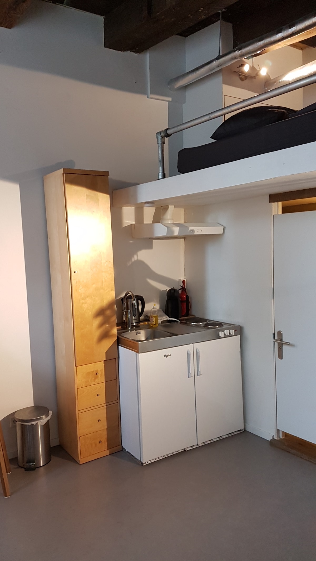 Industrial style renovated studio, part of an old distillery from 1853 located in the historic centre of Schiedam. Within walking distance of Lange haven, shopping centre, restaurants, jenever museum and stedelijk museum Schiedam. One space with own kitchen and private bathroom. One dubble bed and a sofa bed. Rent only for non smokers. not for children under 6 years old. No registration possible. Sustainably built with solar boiler and solar panels