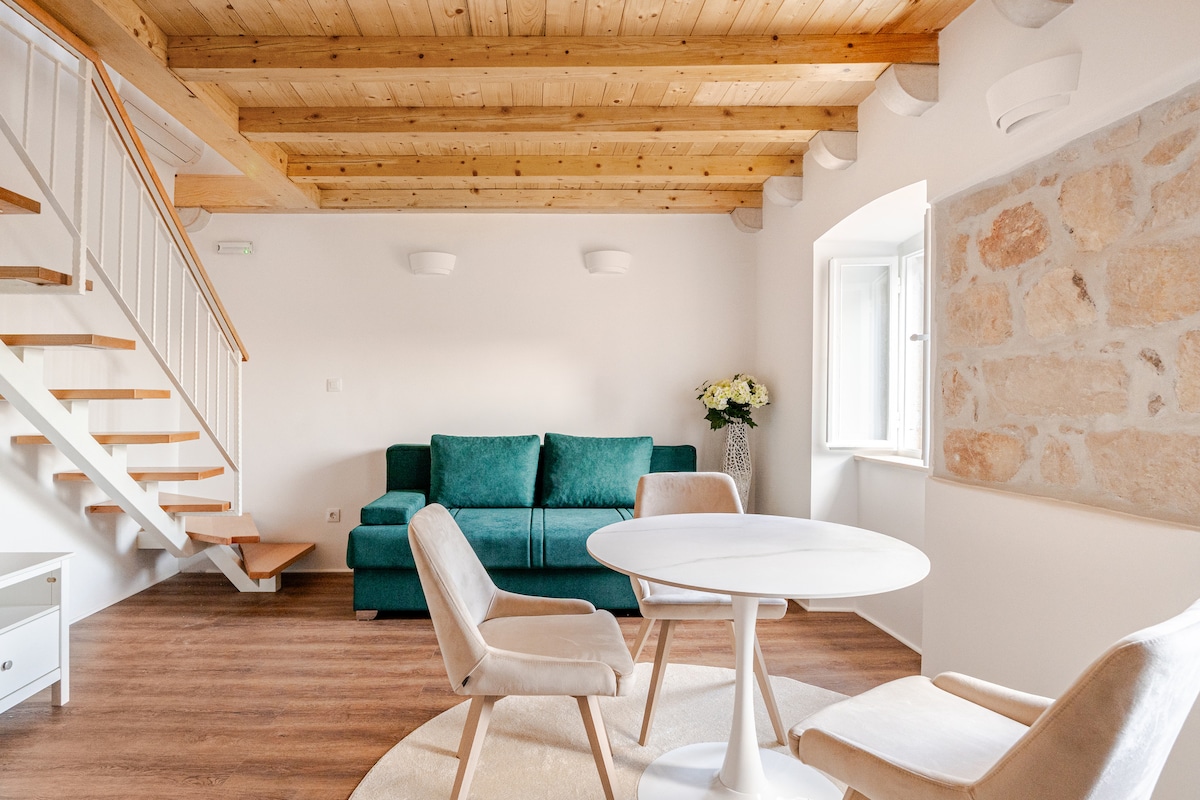 Nestled in a tranquil corner of the walled city, right at the base of the iconic Minceta Tower, this cozy two-floor apartment offers a welcoming holiday retreat. The ground floor includes a spacious living room with a fully equipped kitchen that opens onto a small terrace. Upstairs, you’ll find two separate bedrooms, each with its own private bathroom—one of which is en-suite. Modern design and amenities blend with a warm, homely atmosphere, well-stocked library, and comfortable seating.