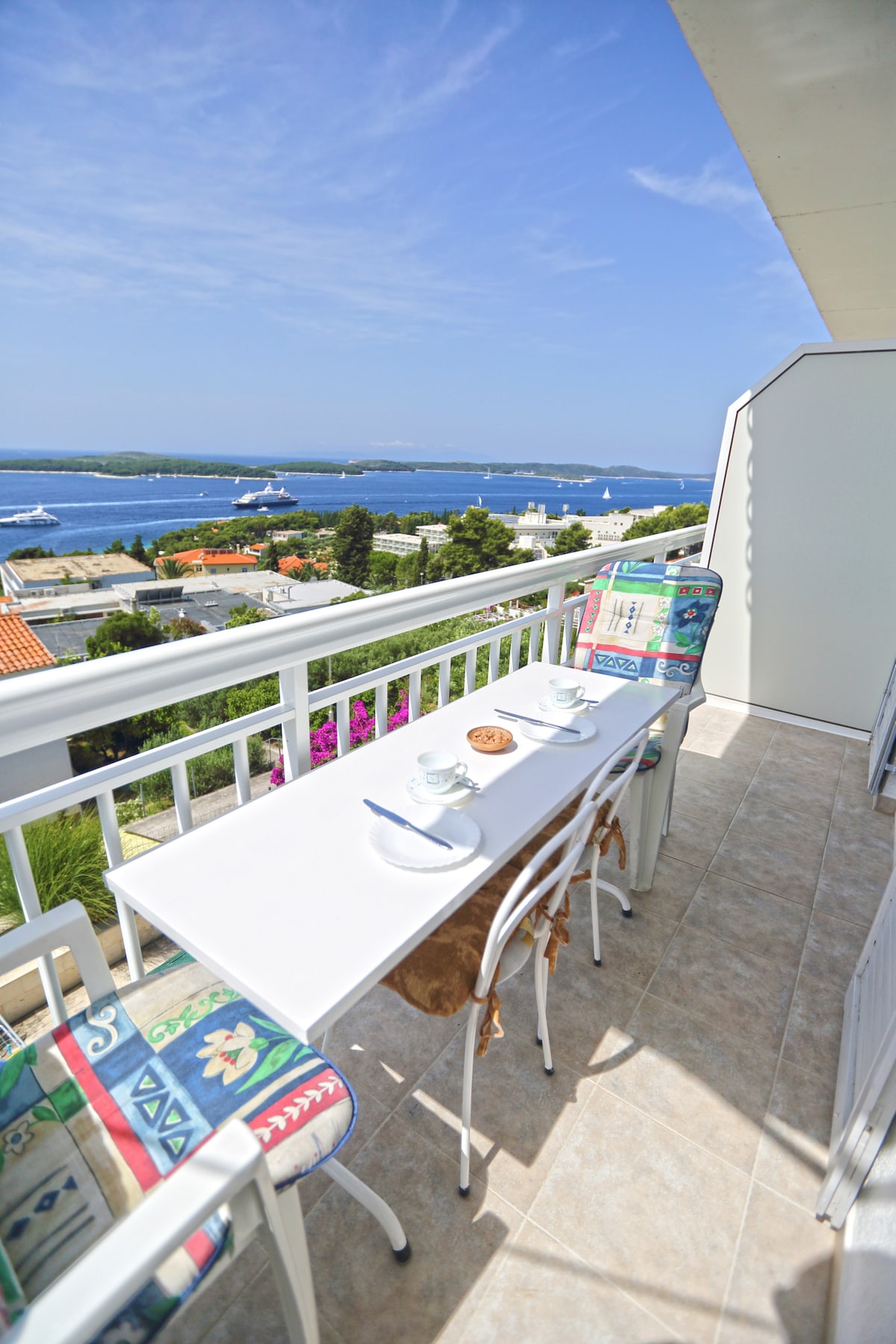 Od dišečih cvetličnih rešetk na vhodu do ljubke spalnice - vsaka gostoljubna podrobnost tega lepega stanovanja je bila premišljena. Uživajte v masažni kadi na ogromnem balkonu s 180-stopinjskim razgledom in občudujte razgled na mesto Hvar in Paklene otoke.