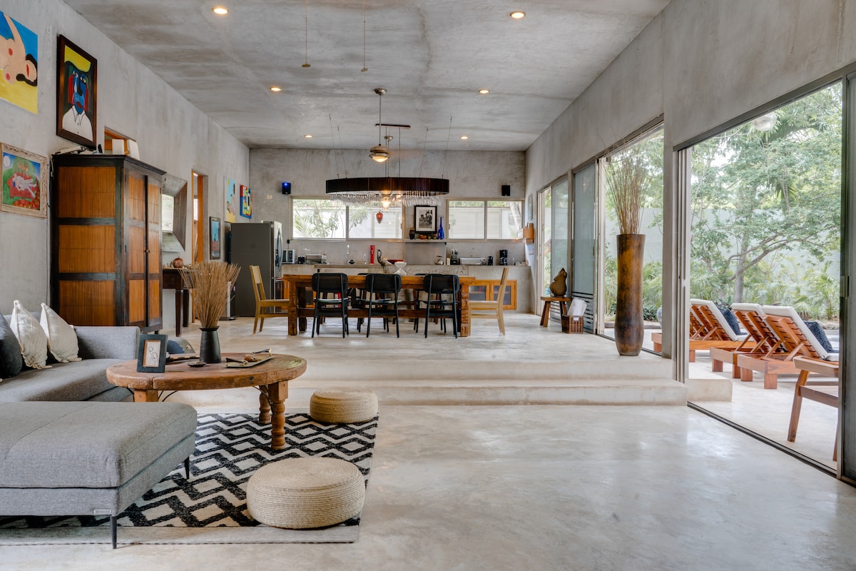 BLIZU PLAŽE ! V osrčju Tulum Beach Road. Odprite okno spalnice in stopite v pesek... Nič ni boljšega od tega. Razkošje je jutranja kava, obrnjena proti vodi ob sončnem vzhodu in iz vašega bivališča. Najtežja izbira je, ali boste najprej šli na jutranjo kopel ali kavo. Namestitev ima zasebno plažo, ki se nahaja na idealni lokaciji med dvema slavnima hoteloma. Ponoči se lahko sprehajate po obalni cesti in vseh njenih znanih restavracijah in trgovinah. Namestitev je pravi DRAGULJ.