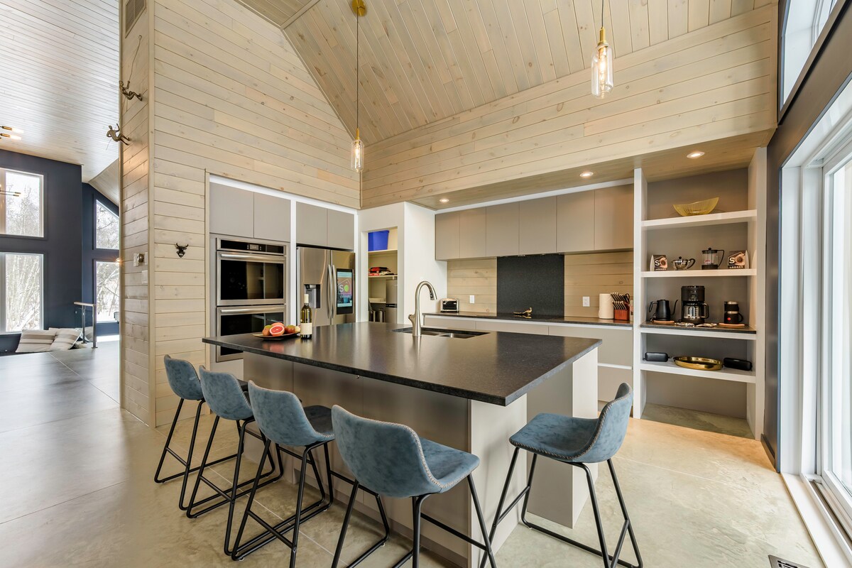 Monumental open concept, in the heart of nature. Access to trails directly behind the house. Wood stove, large modern bathroom, one bedroom + sofa bed. Another sofa bed in the living room. Ideal chalet for a couple with children or two couples. Wild birds, turkey, and deer lovers welcome! Wifi and EV charger included. Dogs Welcome! CITQ : #308038