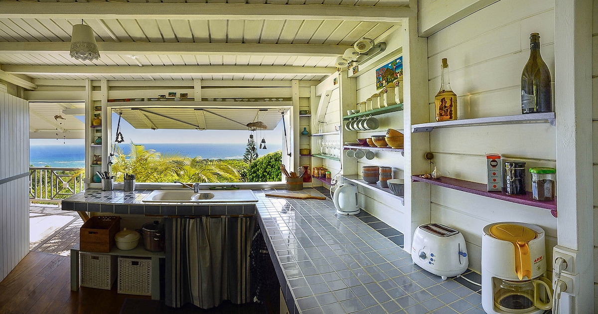 Kazalia se nahaja na višavah Capesterre s panoramskim razgledom na laguno, 2 km od vasi (nepogrešljivo vozilo) in čudovito plažo Feuillère. Obdan z velikim tropskim vrtom je moj kraj idealen za par, ki je zaljubljen v mir in naravo . Trgovina z vetrom nadomešča klimatsko napravo. Prvi večerni obrok na zahtevo. Prvi brezplačni zajtrk za bivanje enega tedna ali več. Minimalno 3 noči