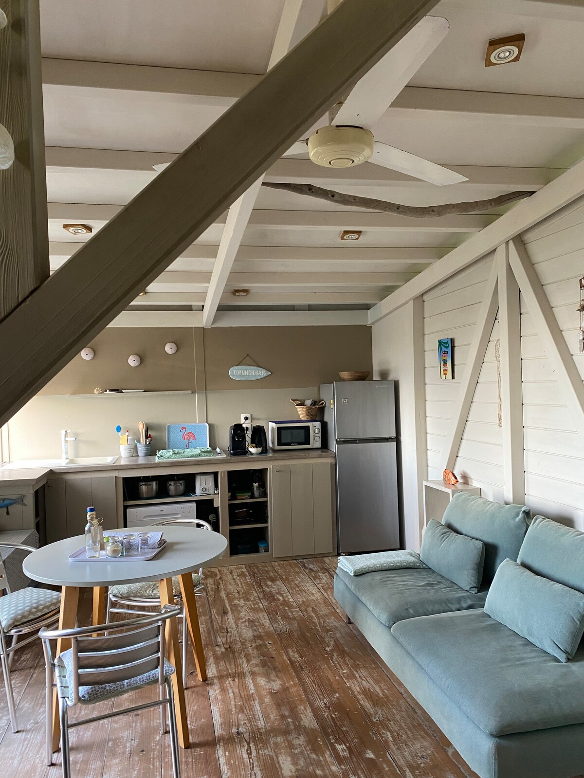 Sprostite se v tej okolju prijazni nastanitvi, ki je zasnovana za popoln počitek in sprostitev. Topel in udoben dekor, svetli prostori in zagotovljena zasebnost. Uživajte v edinstvenem doživetju z zunanjim prham in masažno kadjo pod zvezdami v tropskem vrtu, ki ga je zasnovala Mylène. Za nepozabno bivanje vam Kazaperrok ponuja možnost, da obiščete in občudujete naše papige Chacho, Oharo, Coco, Juliette, Paca in Fijija.