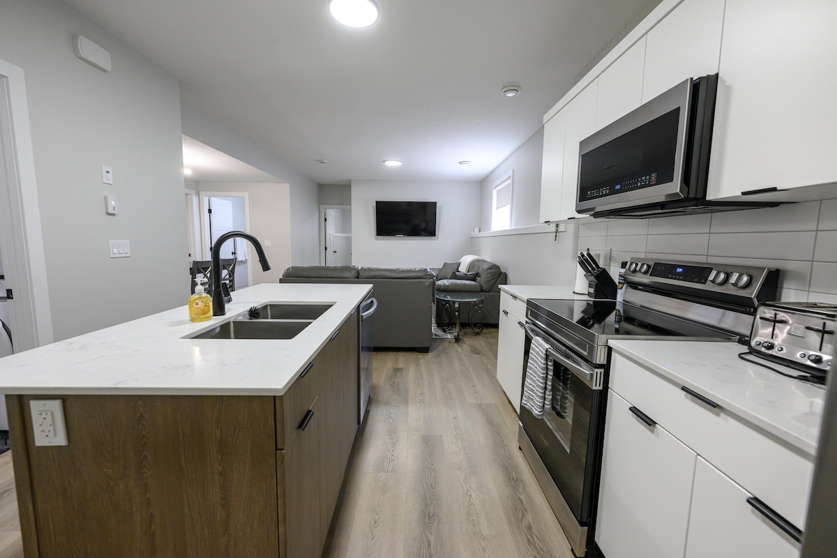 Uživajte v brezplačnem vinu v naši prostorni wine-bar suite v Westgate, ob letališču. 1 spalnica suite s polno kuhinjo, umivalnica, pralnica, 2 dnevni prostori, & garaža. Kuhinja ima vse naprave, vključno s pomivalnim strojem, dnevni prostor ima 65-palčnipametni televizor, pralnica vključuje pralni/sušilni stroj, spalnica pa ima pisarniški/pisarniški stol. Suite ima visoke strope, ogromna okna, ni sosedov na 3 straneh, igrišče/park/jezero s tekalno stezo čez cesto, in ni preproga tako enostavno čiščenje za otroke in hišne ljubljenčke.
