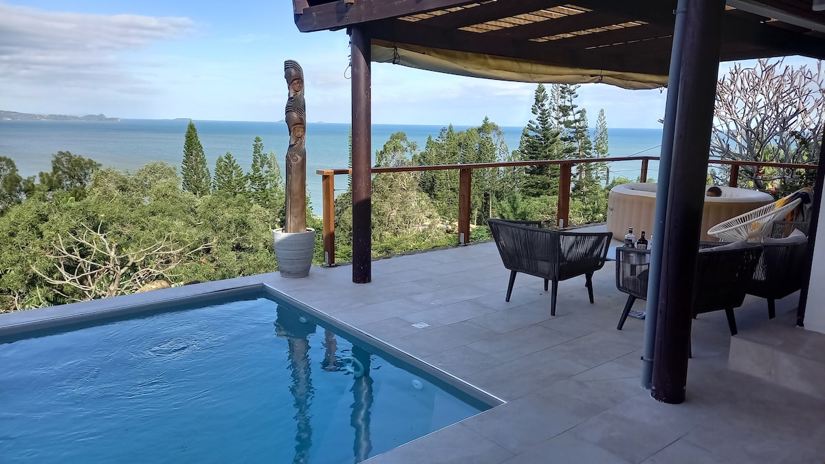 Ideal for those who love peace and quiet, enjoy a revitalizing stay in our home. The view of the mountain range invites you to relax by the pool. Located in a residential valley just 7 minutes from the village, all amenities are close by. The beaches of La Roche Percée and Poé, as well as the Déva Nature Reserve, are within 15 to 25 minutes. At night, the home's bioclimatic design ensures a restful sleep.
