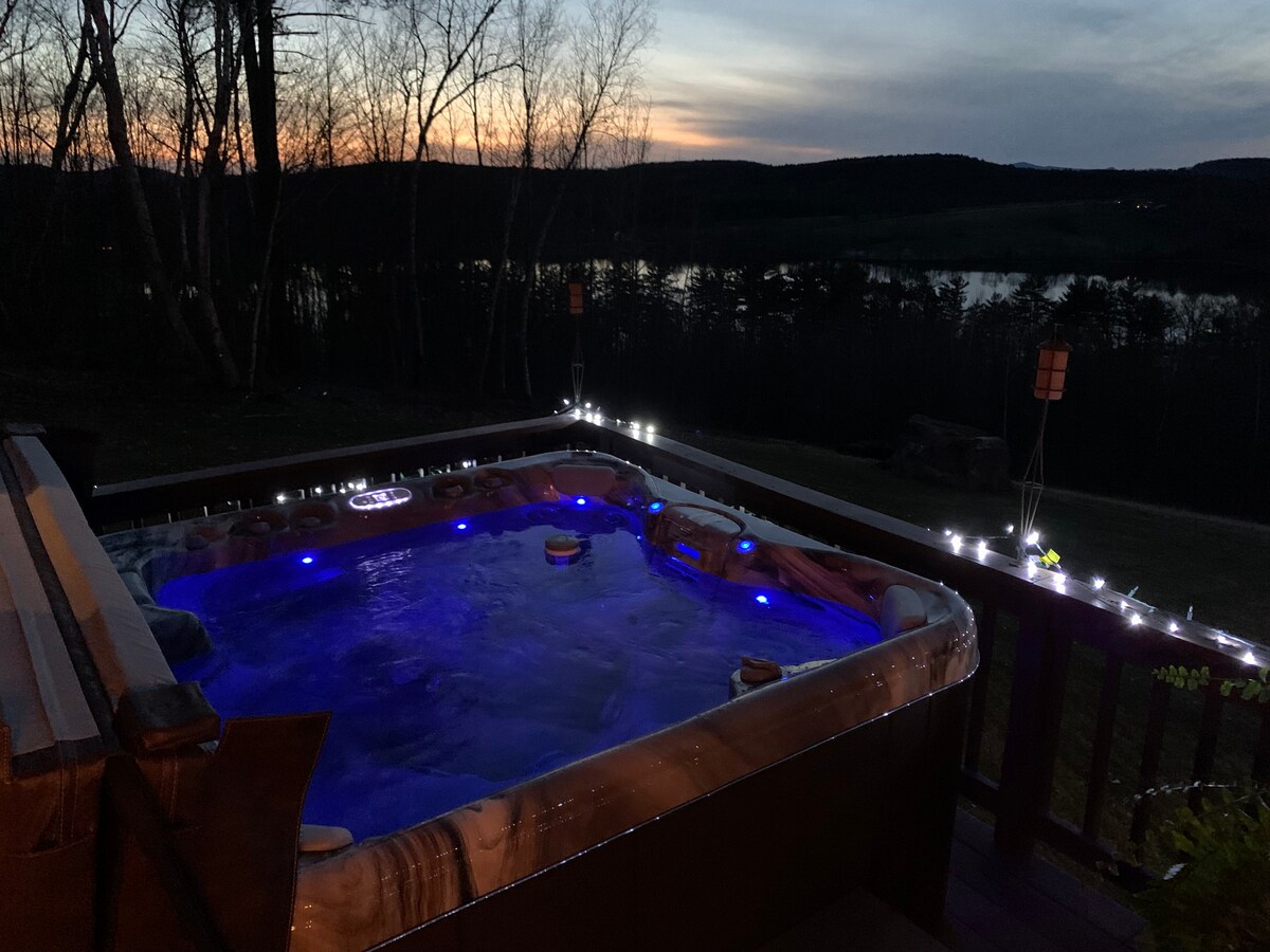 Koča s pogledom na vrh se ponaša s 3 hektarji v čudovitih zelenih gorah, na nadmorski višini je 1,700 čevljev. V tej na novo zgrajeni koči, ki je PRIMERNA ZA HIŠNE LJUBLJENČKE, boste imeli 3 spalnice in 2 kopalnici z WC-jem, v katerih bo udobno spalo 7 oseb. Imamo popolnoma novo MASAŽNO KAD za 6 oseb! V 15 minutah boste prispeli do svetovno znanega Stratton mtn, 15 minut od Bromley mtn in blizu 4 minute do lokalnega Magic mtn. Zelo blizu mesta Manchester, ki ima odlične trgovine in restavracije