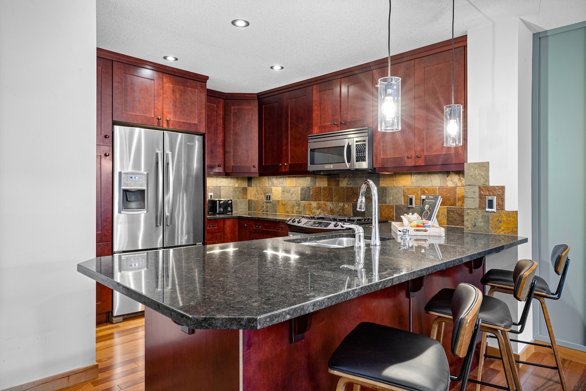 Dobrodošli v luksuznem oddihu v osrčju Canmora! Razkošna penthouse enota z osupljivim razgledom na gore! - To razkošno in posodobljeno večnadstropno podstrešno stanovanje je kotna enota, obrnjena proti jugu in ima spektakularen razgled na naravo. Vrhunsko in leseno pohištvo je ustvarilo sodobno počitniško hišo, ki ste jo obiskali. Fitnes center in romantična masažna kad na strehi na prostem s 360-stopinjskim razgledom na Bow Valley sta priročno oddaljena le nekaj korakov.