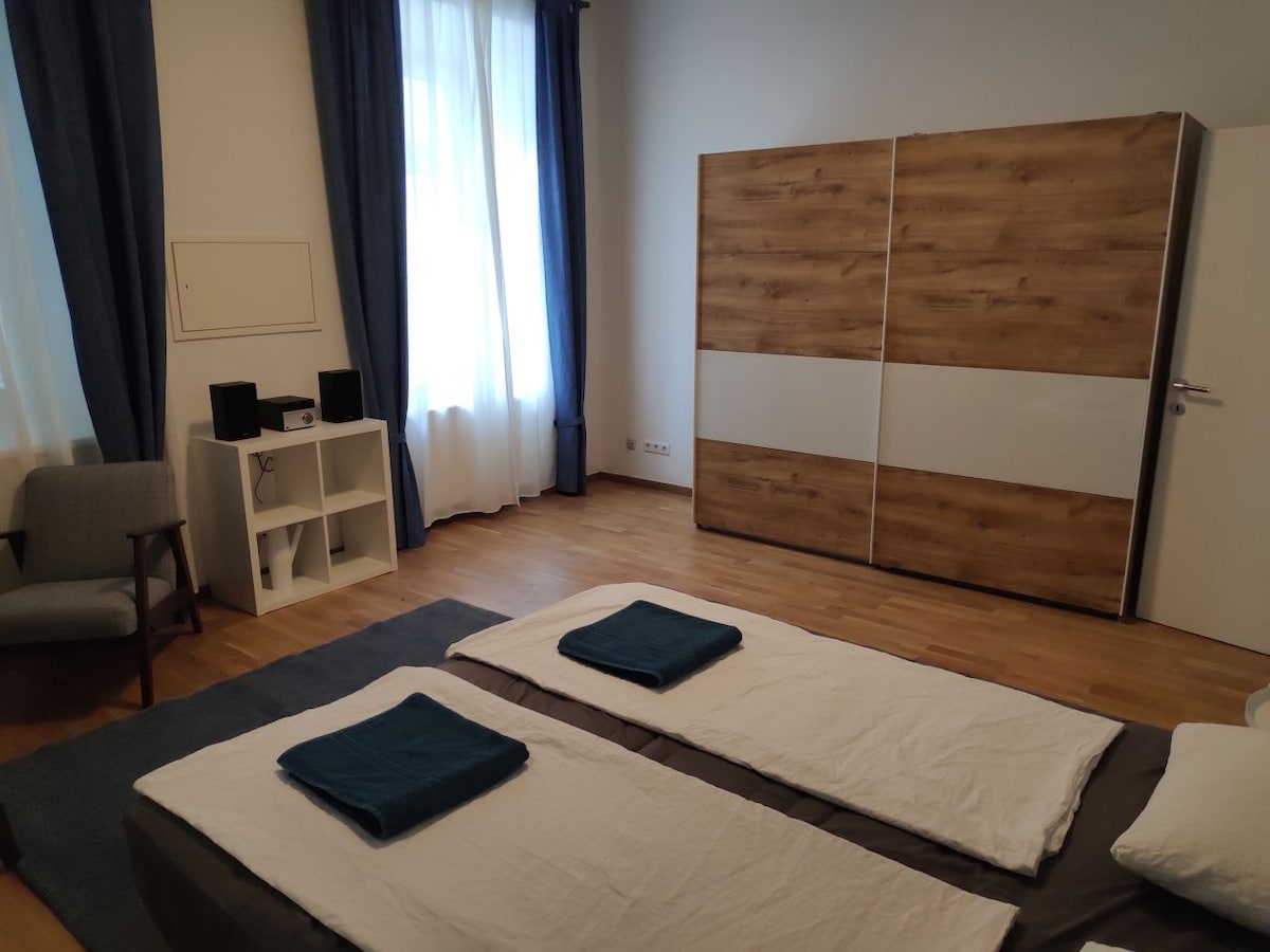 Veselimo se, da vas bomo lahko sprejeli v našem na novo prenovljenem in z ljubeznijo opremljenem stanovanju v drugem nadstropju čudovite stare stavbe na robu mestnega parka v Gradcu. Naše stanovanje je sestavljeno iz velike spalnice, prostorne dnevne sobe, kuhinje, kopalnice in ločenega stranišča. Iz dnevne sobe si lahko ogledate vrtni vrt kavarne z najboljšim zajtrkom v mestu.