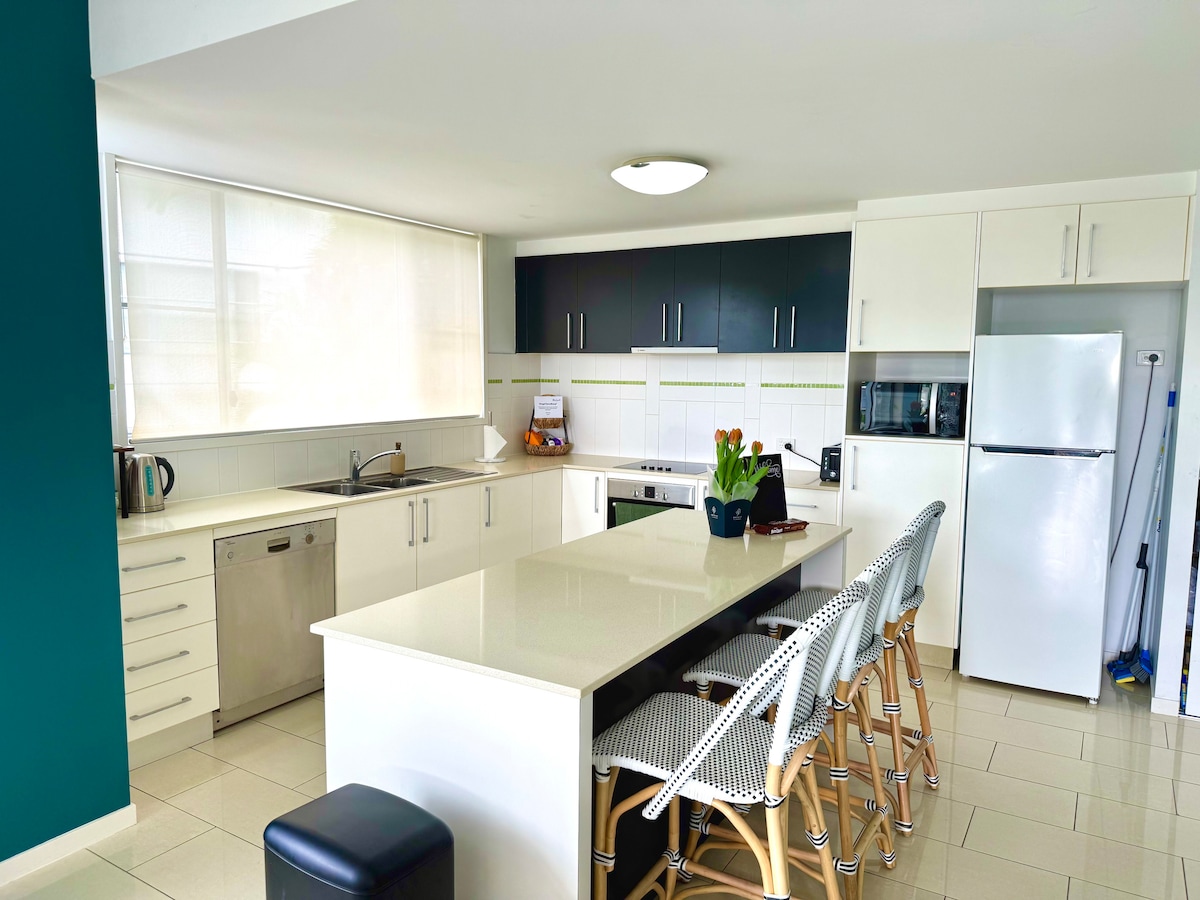 Bivajte v našem na novo prenovljenem dvosobnem prenočišču za 5 oseb v osupljivem letovišču »The Lakes«. Na voljo so igrače za majhne otroke. Uživajte v popolnem družinskem oddihu. S 4 različnimi bazeni, prostori za peko na žaru, igriščem, teniškim igriščem, kavarno in restavracijo v tej mirni, ograjeni skupnosti. Minute od Esplandea, CBD-ja in botaničnih vrtov. Avtobusna postaja tik pred vami in postaja električnih skuterjev za raziskovanje ali preprosto sproščanje v bazenih ves dan! Dobrodošli v raju