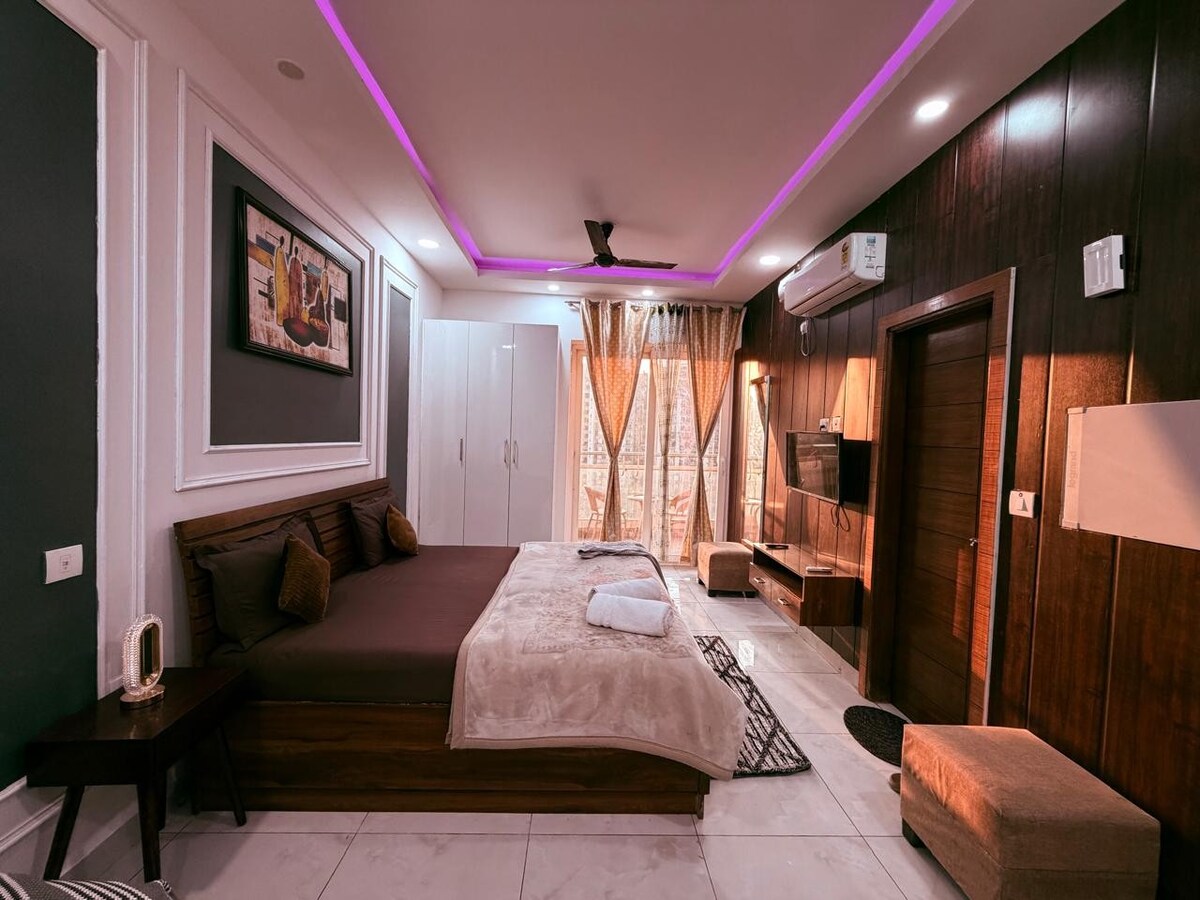 »Pobegnite v svoje elegantno zatočišče v osrčju širše Noide«. To elegantno studio stanovanje je popolno zatočišče za samostojne pustolovce, pare ali poslovne popotnike, ki iščejo udobje in priročnost. Prostor: Stanovanje ima udobno veliko zakonsko posteljo s plišasto posteljnino, udobno sedežno garnituro in namenski delovni prostor. Sodobna kuhinjska niša je opremljena z vsem, kar je bistveno. Dostop za goste: Imeli boste ekskluziven dostop do celotnega garsonjere. Na voljo je samostojni vstop.