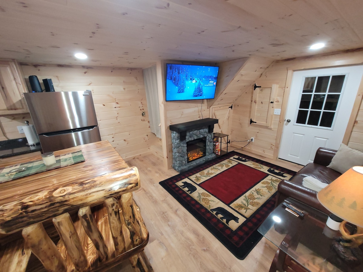Slikovita, udobna brunarica, ki se nahaja v gozdu. Popolnoma opremljena in okrašena. Kuhinja, 1,5 kopalnica, pralni/sušilni stroj. 1 spalnica z zakonsko posteljo in enojnima posteljama. 1 soba z zakonsko posteljo. Na voljo sta 2 enojni postelji. Oglejte si slike glede dimenzij postelje. Dostop za invalide, miza, Wi-Fi, brez stacionarnega omrežja, dober verizonski signal,Roku TV, ogrevanje in klimatska naprava. Hišni ljubljenčki so dovoljeni. Lastnik živi nad garažo. Na posesti živijo psi. Koši in petelini so nastanjeni v bližini koče, podnevi in ponoči lahko povzročajo hrup. Velika prednja veranda. Prinesite copate. :-)