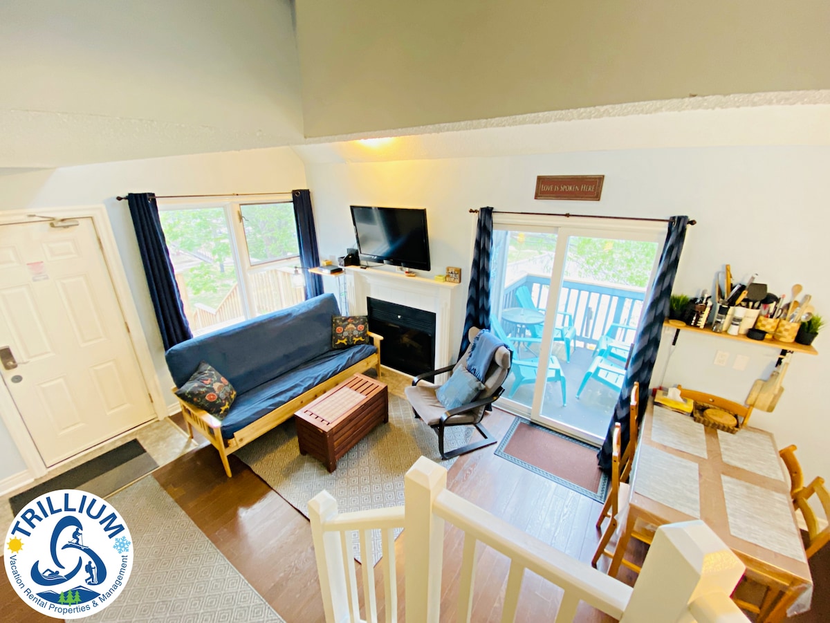 To čudovito dvosobno dvoetažno stanovanje se nahaja v slikovitem Collingwoodu/Blue Mountains v Ontariu. Uživajte v družinam prijaznem prostoru z zasebno teraso, električnim kaminom, kjer se lahko udobno namestite vsak večer, in objektih, ki vključujejo sezonski bazen, masažno kad, teniška igrišča in storitev prevoza na zahtevo - vse to je le nekaj korakov stran od sedežnice in smučarskih prog. Scandinave Spa in plaža Northwinds sta oddaljena le nekaj minut! Vključen je hiter internet, da se sprostite v prostem času.