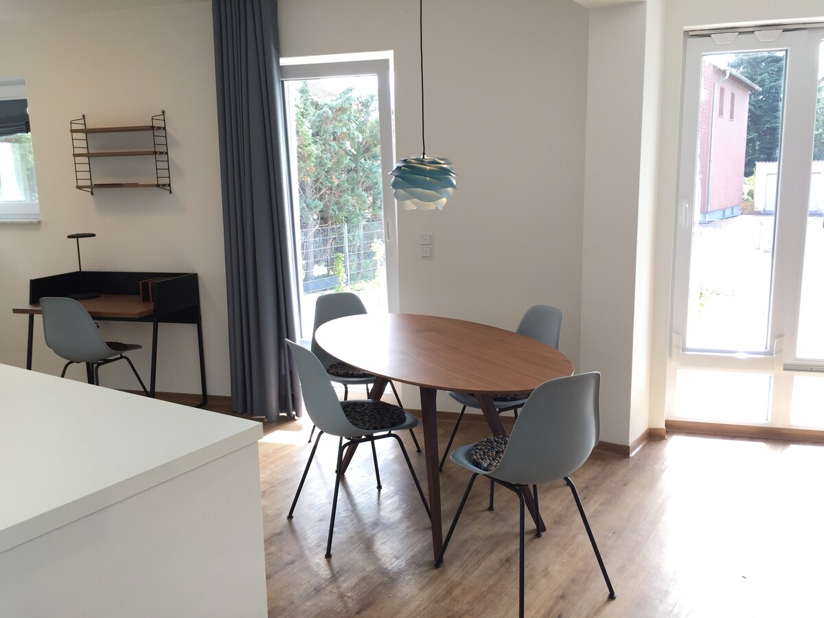 Dobrodošli v mojem svetlem 100 m² velikem stanovanju z balkonom in velikim vrtom! Uživajte na vrtu z žarom (po dogovoru, doplačilo) in balkonu s klopjo. Popolnoma opremljena kuhinja s pečico, mikrovalovno pečico, pomivalnim strojem in aparatom za kavo vas vabi k kuhanju. V dnevni sobi boste našli raztegljiv kavč, v spalnici pa 90 cm posteljo in veliko prostora za shranjevanje. Dve kopalnici, pralni stroj, parkirišče, mirna lokacija v bližini mestnega gozda, igrišče in nakupovanje. Idealno za delo in sprostitev!