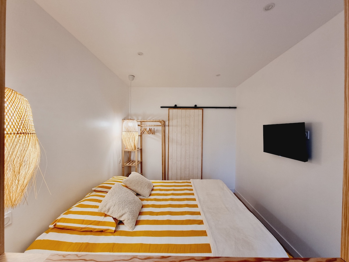 Udobje in mir sredi narave. Z veseljem vas bomo sprejeli v prostornem garsonjerskem apartmaju v velikosti 27 m2, ki se nahaja v novi hiši na podeželju. Na voljo imate dnevno sobo z udobnim kavčem in kuhinjo. Na voljo imate tudi spalnico s televizijo in kopalnico. > NOVA trda vzmetnica debeline 23 cm (marec 2025) > Zagon reverzibilne klimatske naprave v decembru 2025 > Brezplačen dostop do televizije s kanalom Canal+ v spalnici
